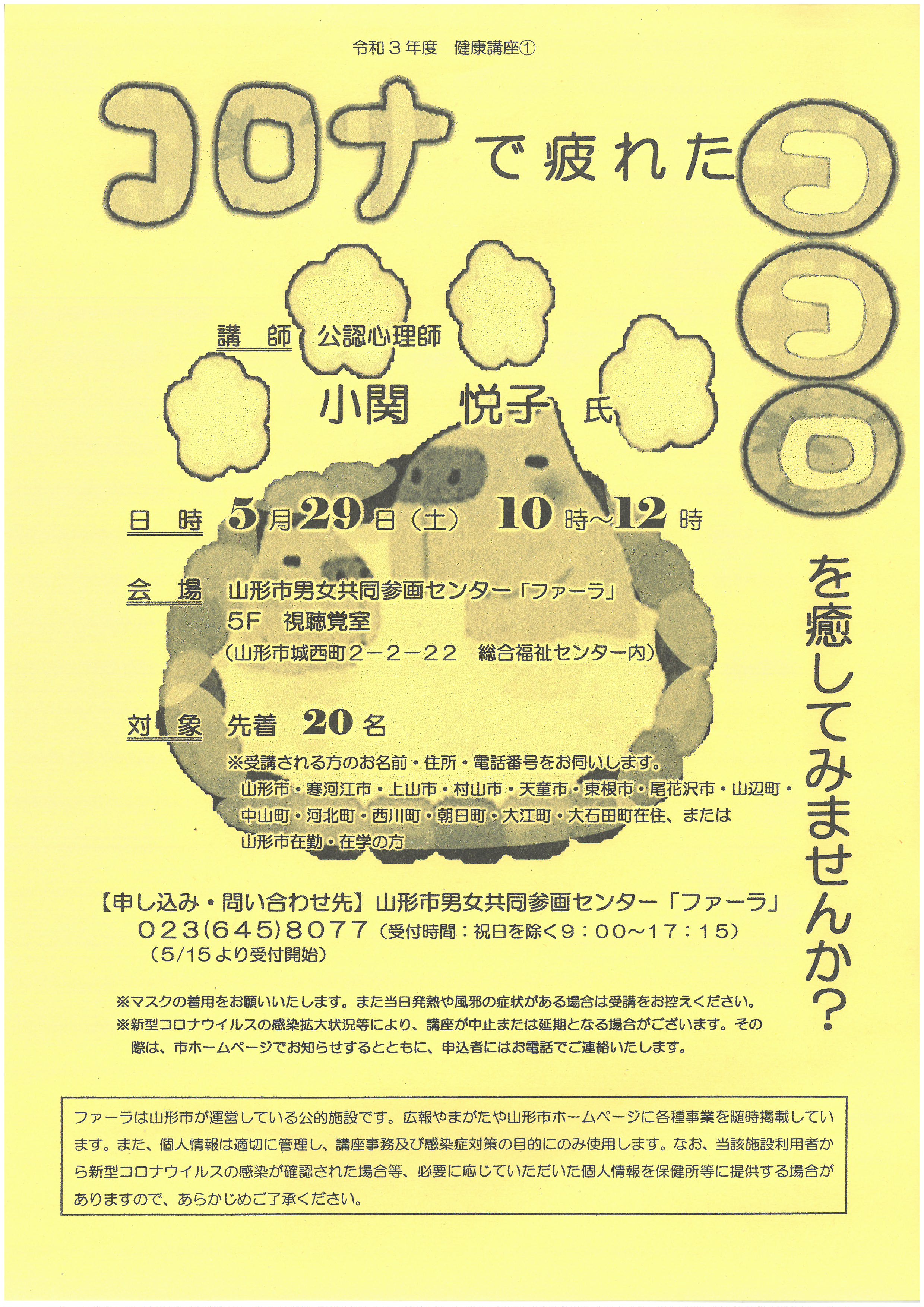 « すべてのイベント このイベントは終了しました。 令和3年度 健康講座① 2021年5月29日10:00 - 12:00 « NPO勉強会~NPO入門編~ 音楽ひろば ぺんたとおん » このチラシはこちらからダウンロードできます。 + Google カレンダー+ iCal エクスポート 詳細 日付: 2021年5月29日 時間: 10:00 - 12:00 イベントカテゴリー: 団体主催 主催者 山形市男女共同参画センター ファーラ 電話番号: 023-645-8077 会場 山形市男女共同参画センター ファーラ 5階 視聴覚室 山形県山形市城西町2-2-22 山形市総合福祉センター内 山形市, 山形県 9900832 日本 + Google マップ