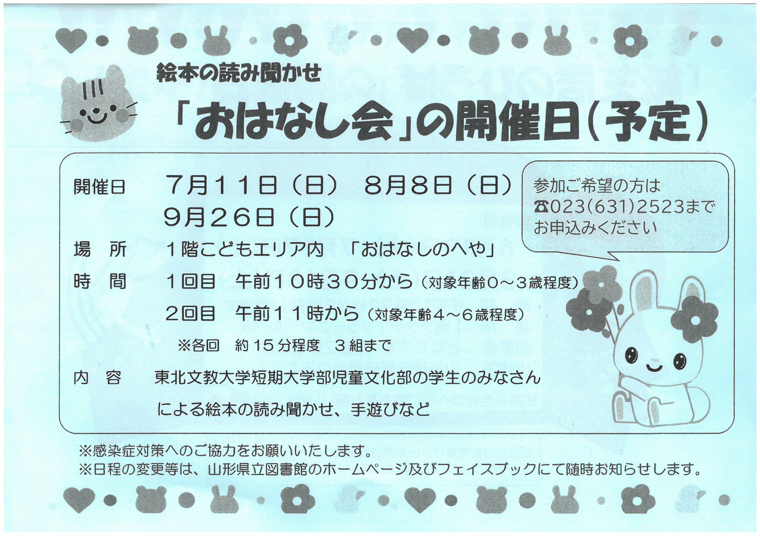 « すべてのイベント このイベントは終了しました。 絵本の読み聞かせ「おはなし会」 2021年9月26日10:30 - 11:30 無料 « 【満員御礼】NPO勉強会 ~NPO法人設立編~ 令和3年度WAM助成シンポジウム NPOと行政との協働の現在地 ~地域共生社会の実現に向けて~ » + Google カレンダー+ iCal エクスポート 詳細 日付: 2021年9月26日 時間: 10:30 - 11:30 参加費: 無料 イベントカテゴリー: 団体主催 Web サイト: https://www.lib.pref.yamagata.jp/index.php?key=jo7m9el7k-1423#_1423 主催者 山形県立図書館 会場 山形県立図書館 1階 アクティブラーニングルーム 緑町1-2-36 山形市, 990-0041 + Google マップ 電話番号: 023-631-2523