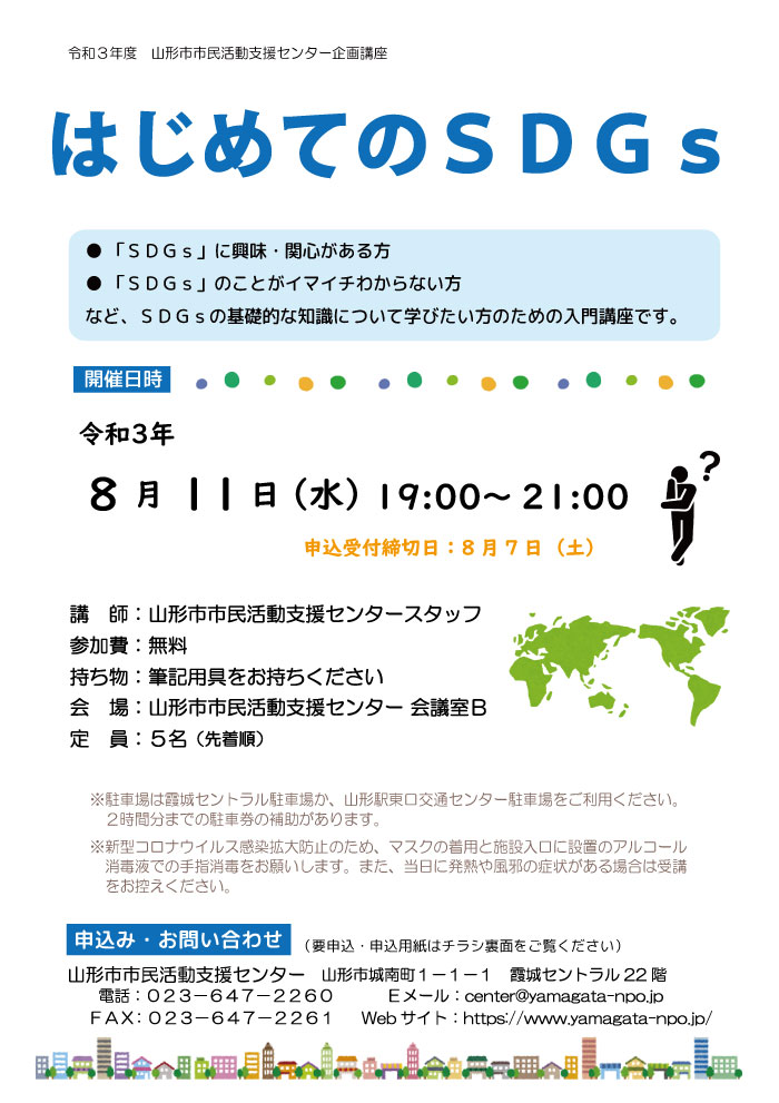 « すべてのイベント このイベントは終了しました。 はじめてのSDGs 2021年8月11日19:00 - 21:00 無料 « 地域食堂「楽(らく)」 第7回 山形小花火大会~一千本の線香花火~ » チラシのダウンロード(PDF) 申込書のダウンロード(PDF・word) + Google カレンダー+ iCal エクスポート 詳細 日付: 2021年8月11日 時間: 19:00 - 21:00 参加費: 無料 イベントカテゴリー: センター主催 主催者 山形市市民活動支援センター 電話番号: 023-647-2260 Web サイト: https://www.yamagata-npo.jp/ 会場 山形市市民活動支援センター ふらっと + 会議室B 山形県山形市城南町1-1-1-22F + Google マップ 電話番号: 023-647-2260 Web サイト: https://www.yamagata-npo.jp/