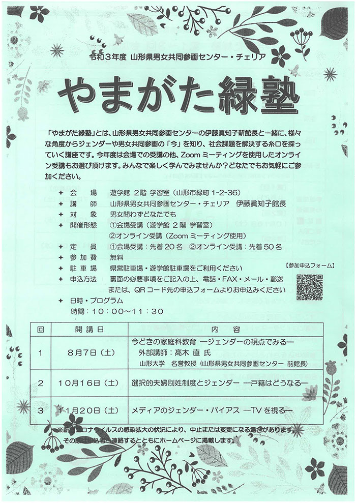 « すべてのイベント このイベントは終了しました。 令和3年度 山形県男女共同参画センター・チェリア やまがた緑塾 2021年10月16日10:00 - 11:30 « 人と人がつながる地域支え合い活動マッチングセミナー(団体向け事前説明会) 共働き家族の「お家のこと」シェア » 講座第2回目の10月16日(土)の申込み締切りは10月6日(水)です。 チラシはこちらからダウンロードできます。(PDF) + Google カレンダー+ iCal エクスポート 詳細 日付: 2021年10月16日 時間: 10:00 - 11:30 イベントカテゴリー: 団体主催 主催者 山形県男女共同参画センター チェリア 電話番号: 023-629-7751 メール: cheria1@yamagata-cheria.org Web サイト: https://www.yamagata-cheria.org/ 会場 遊学館 2階 学習室 緑町1-2-36 山形市, + Google マップ 電話番号: 0236256411