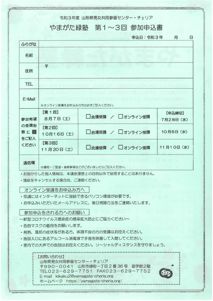 « すべてのイベント このイベントは終了しました。 令和3年度 山形県男女共同参画センター・チェリア やまがた緑塾 2021年11月20日10:00 - 11:30 « 令和3年度やまがたNPO活動促進大会 2021年度まいど(毎週土曜日)おなじみの山形元気づくり創業塾 » 講座第3回目の11月20日(土)の申込み締切りは11月10日(水)です。 チラシはこちらからダウンロードできます。(PDF) + Google カレンダー+ iCal エクスポート 詳細 日付: 2021年11月20日 時間: 10:00 - 11:30 イベントカテゴリー: 団体主催 主催者 山形県男女共同参画センター チェリア 電話番号: 023-629-7751 メール: cheria1@yamagata-cheria.org Web サイト: https://www.yamagata-cheria.org/ 会場 遊学館 2階 学習室 緑町1-2-36 山形市, + Google マップ 電話番号: 0236256411
