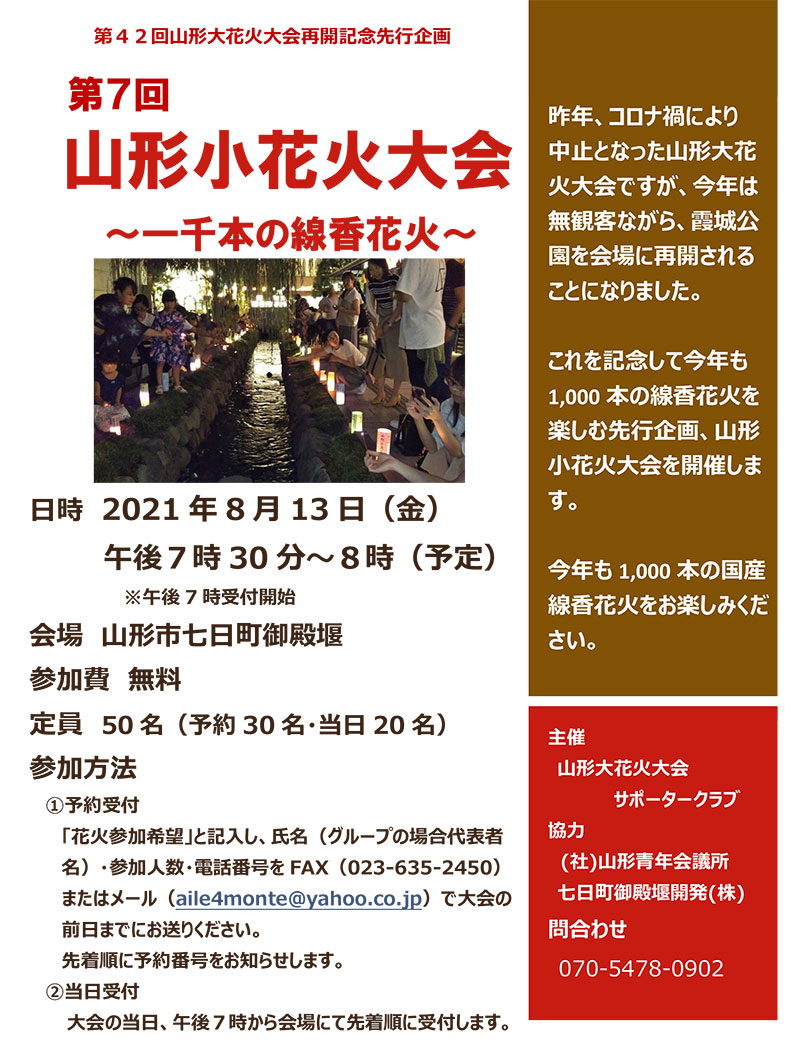 « すべてのイベント このイベントは終了しました。 第7回 山形小花火大会~一千本の線香花火~ 2021年8月13日19:30 - 20:00 « はじめてのSDGs センターで気軽にボランティア » チラシはこちらからダウンロードできます(PDFデータ) + Google カレンダー+ iCal エクスポート 詳細 日付: 2021年8月13日 時間: 19:30 - 20:00 イベントカテゴリー: 団体主催 主催者 山形大花火大会サポータークラブ 電話番号: 070-5478-0902 メール: aile4monte@yahoo.co.jp 会場 山形市七日町御殿堰