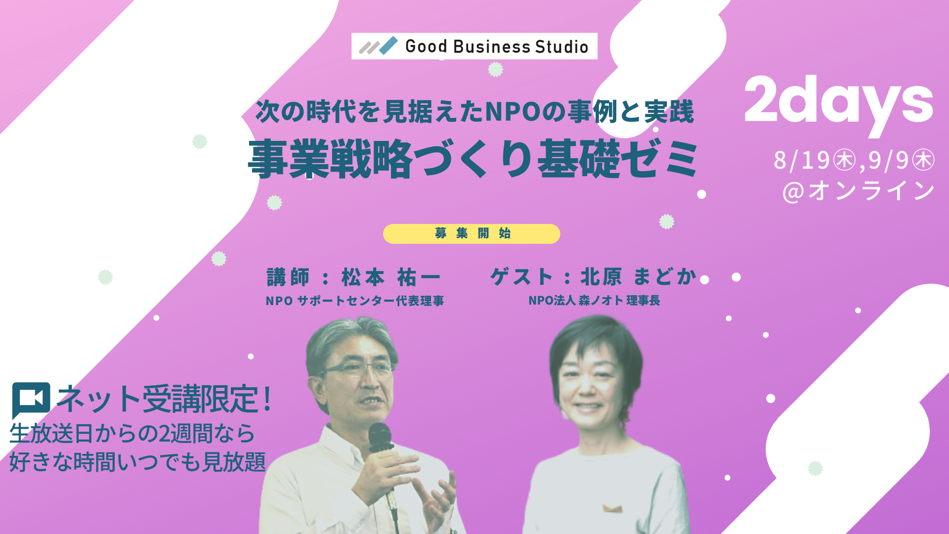 <生放送日時> [第1回]8月19日(木)15:00-17:00 [第2回]9月9日(木)15:00-17:00 ※生放送時間+終了直後から2週間以内であれば、映像を何回でも視聴できます。 <受講料> ・オンライン受講(2回セット) : 3,000円 ・オンライン受講(第2回「事業戦略づくりLIVE」のみ):2,000円 <講師> ・松本 祐一(NPO法人 NPOサポートセンター 代表理事 / 多摩大学 経営情報学部 教授) ・ゲスト : 北原まどか(特定非営利活動法人 特定非営利活動法人森ノオト 理事長) <学べること> ・NPO活動のモデルチェンジやソーシャル・マーケティングに関する基礎知識の習得 ・NPOによる事業の見直し、戦略づくりの事例の理解 ・次の3年~5年を見据えた事業戦略をつくるための考え方、フレームワークの使い方 ▼お申込み、詳細はこちらから https://npo-sc.org/training/good-business-studio/curriculum/21009/