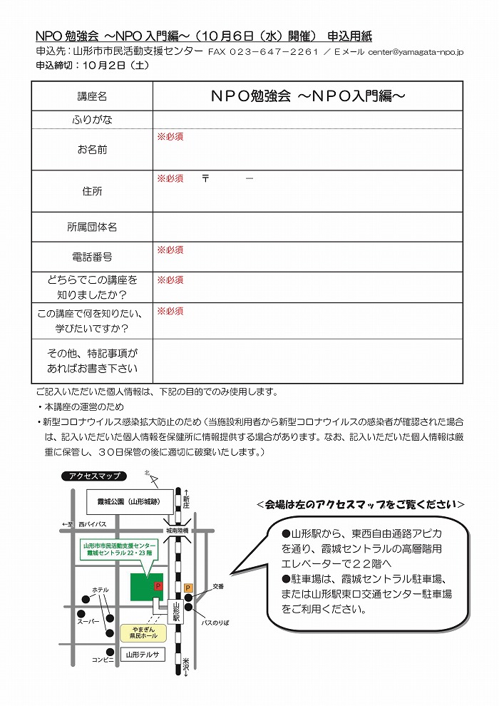 « すべてのイベント このイベントは終了しました。 NPO勉強会~NPO入門編~ 2021年10月6日19:00 - 21:00 « 基礎知識と効率化のノウハウを学び、改善につながる「NPO会計業務入門」[第2回] 足のトラブル、あなたの足は大丈夫?~フットケアをしてみよう~ » チラシのダウンロード(PDF) 申込書のダウンロード(word) + Google カレンダー+ iCal エクスポート 詳細 日付: 2021年10月6日 時間: 19:00 - 21:00 イベントカテゴリー: センター主催 主催者 山形市市民活動支援センター 電話番号: 023-647-2260 Web サイト: https://www.yamagata-npo.jp/ 会場 山形市市民活動支援センター 会議室B 城南町1-1-1 霞城セントラル 山形市, 山形県 9908580 日本 + Google マップ 電話番号: 023-647-2260