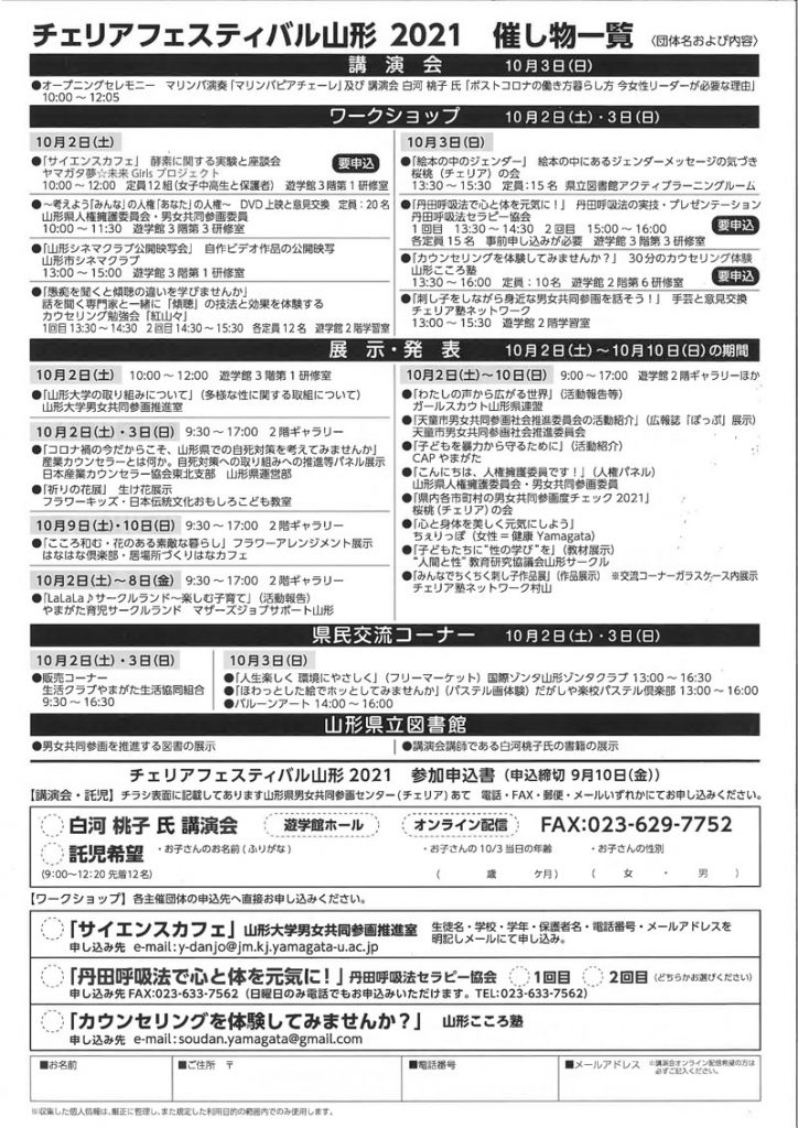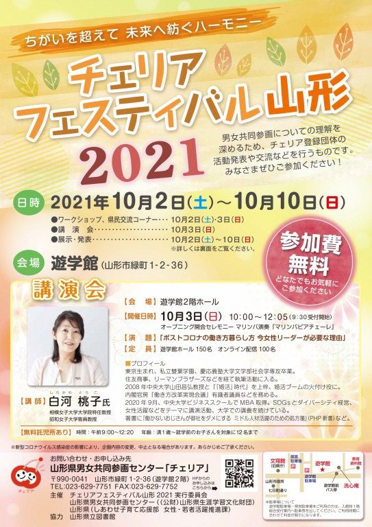 « すべてのイベント このイベントは終了しました。 チェリアフェスティバル山形2021 2021年10月2日 - 2021年10月10日 参加無料 « 難病患者を支援するための研修会 「医療講演会」のご案内 2021年度まいど(毎週土曜日)おなじみの山形元気づくり創業塾 » チラシはこちらからダウンロードできます(PDF形式) + Google カレンダー+ iCal エクスポート 詳細 開始: 2021年10月2日 終了: 2021年10月10日 参加費: 参加無料 イベントカテゴリー: 団体主催 Web サイト: https://yamagata-cheria.org/ 主催者 山形県男女共同参画センター チェリア 電話番号: 023-629-7751 メール: cheria1@yamagata-cheria.org Web サイト: https://www.yamagata-cheria.org/ 会場 山形県生涯学習センター遊学館 緑町1-2-36 山形市, 山形県 9900041 + Google マップ