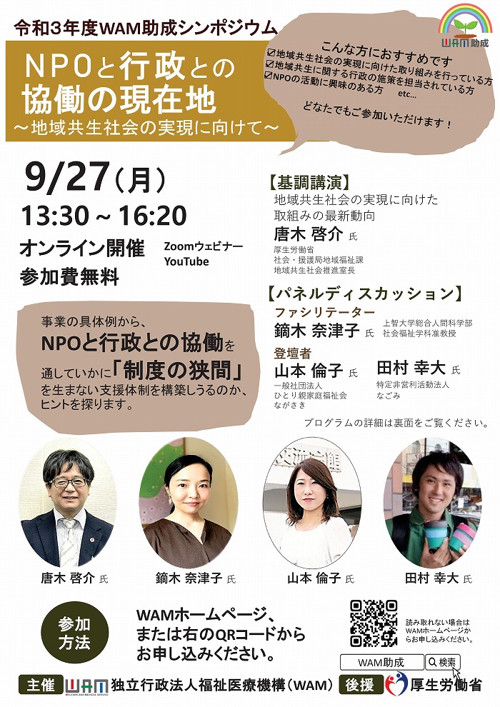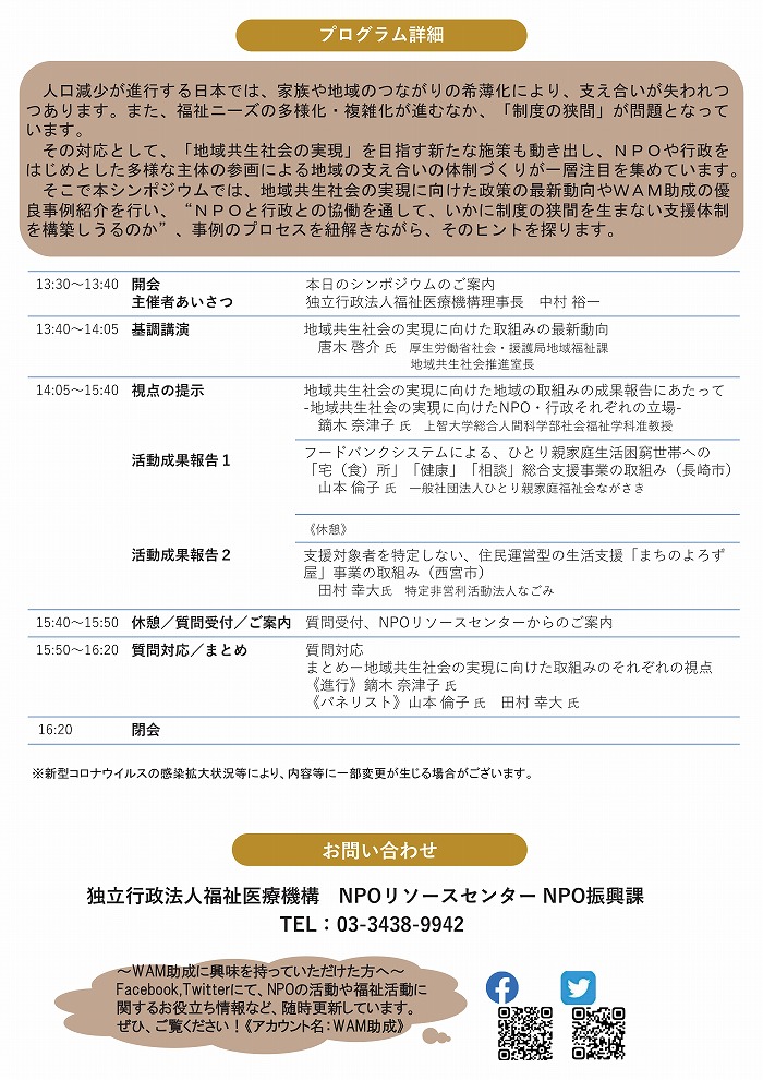 « すべてのイベント このイベントは終了しました。 令和3年度WAM助成シンポジウム NPOと行政との協働の現在地 ~地域共生社会の実現に向けて~ 2021年9月27日13:30 - 16:20 « 絵本の読み聞かせ「おはなし会」 地域食堂「楽(らく)」 » チラシはこちらからダウンロードできます(PDFデータ) + Google カレンダー+ iCal エクスポート 詳細 日付: 2021年9月27日 時間: 13:30 - 16:20 イベントカテゴリー: 団体主催 Web サイト: https://www.wam.go.jp/hp/r3_wam_josei_symposium/ 主催者 独立行政法人福祉医療機構(WAM) 電話番号: 03-3438-9942 会場 (オンライン開催)