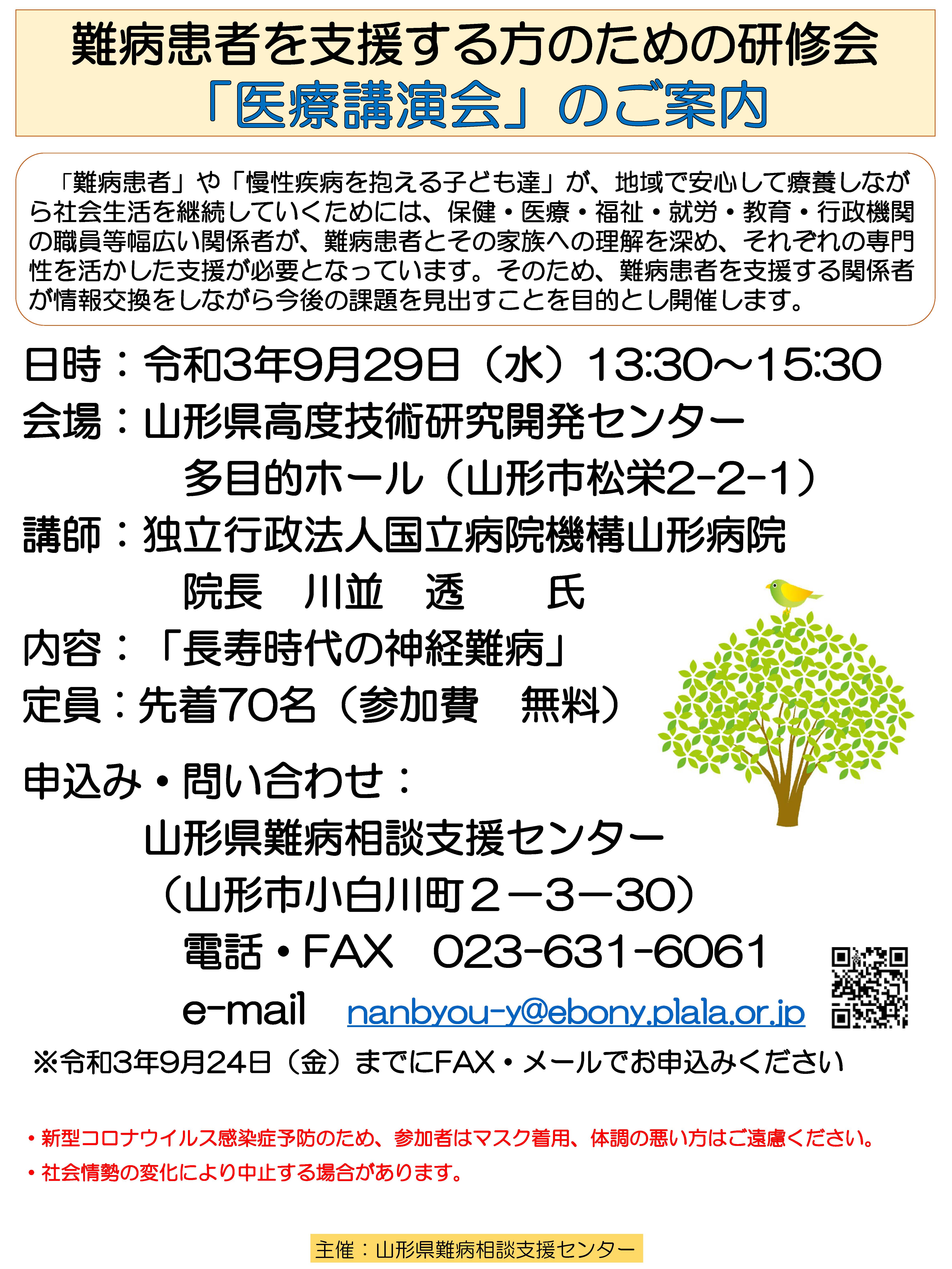 « すべてのイベント このイベントは終了しました。 難病患者を支援するための研修会 「医療講演会」のご案内 2021年9月29日13:30 - 15:30 無料 « 「連携を生み出す助成」積水ハウスマッチングプログラム2022年度助成事業説明会 チェリアフェスティバル山形2021 » このちらしはこちらからダウンロードできます。(pdf) + Google カレンダー+ iCal エクスポート 詳細 日付: 2021年9月29日 時間: 13:30 - 15:30 参加費: 無料 イベントカテゴリー: 団体主催 主催者 山形県難病相談支援センター 電話番号: 023-631-6061 / 023-664-0179(小児慢性専用) メール: nanbyou-y@ebony.plala.or.jp Web サイト: http://www17.plala.or.jp/nanbyou-yamagata/ 会場 山形県高度技術研究開発センター 多目的ホール 松栄2-2-1 山形市, 山形県 日本 + Google マップ