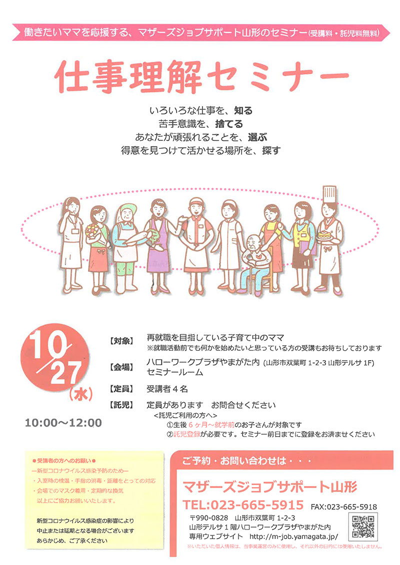 « すべてのイベント このイベントは終了しました。 仕事理解セミナー 2021年10月27日10:00 - 12:00 « 支え合いの地域づくり担い手養成講座in庄内 第5回 このままでいいの?SDGs ~自発的国別レビュー(VNR)から見えること~ » チラシはこちらからダウンロードできます(PDF) + Google カレンダー+ iCal エクスポート 詳細 日付: 2021年10月27日 時間: 10:00 - 12:00 イベントカテゴリー: 団体主催 Web サイト: http://m-job.yamagata.jp/log/?l=504462 主催者 マザーズジョブサポート山形 電話番号: 023-665-5915 Web サイト: http://m-job.yamagata.jp/ 会場 ハローワークプラザやまがた内 セミナールーム 双葉町1-2-3 山形市, 山形県 9900828 + Google マップ