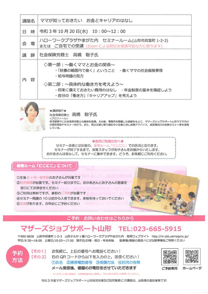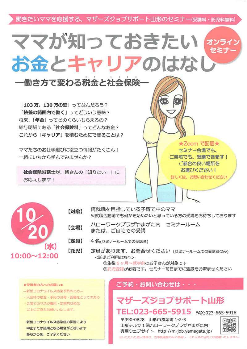 « すべてのイベント このイベントは終了しました。 ママが知っておきたいお金とキャリアのはなし 2021年10月20日10:00 - 12:00 « オンライン会議が劇的に変わる「会議を支えるデザインとファシリテーションの技術」 NPO法人の会計基礎を学ぶ » チラシはこちらからダウンロードできます(PDF) + Google カレンダー+ iCal エクスポート 詳細 日付: 2021年10月20日 時間: 10:00 - 12:00 イベントカテゴリー: 団体主催 Web サイト: http://m-job.yamagata.jp/log/?l=504460 主催者 マザーズジョブサポート山形 電話番号: 023-665-5915 Web サイト: http://m-job.yamagata.jp/ 会場 ハローワークプラザやまがた内 セミナールーム 双葉町1-2-3 山形市, 山形県 9900828 + Google マップ