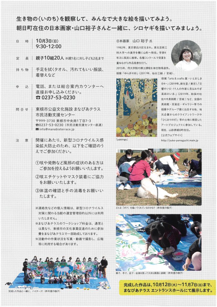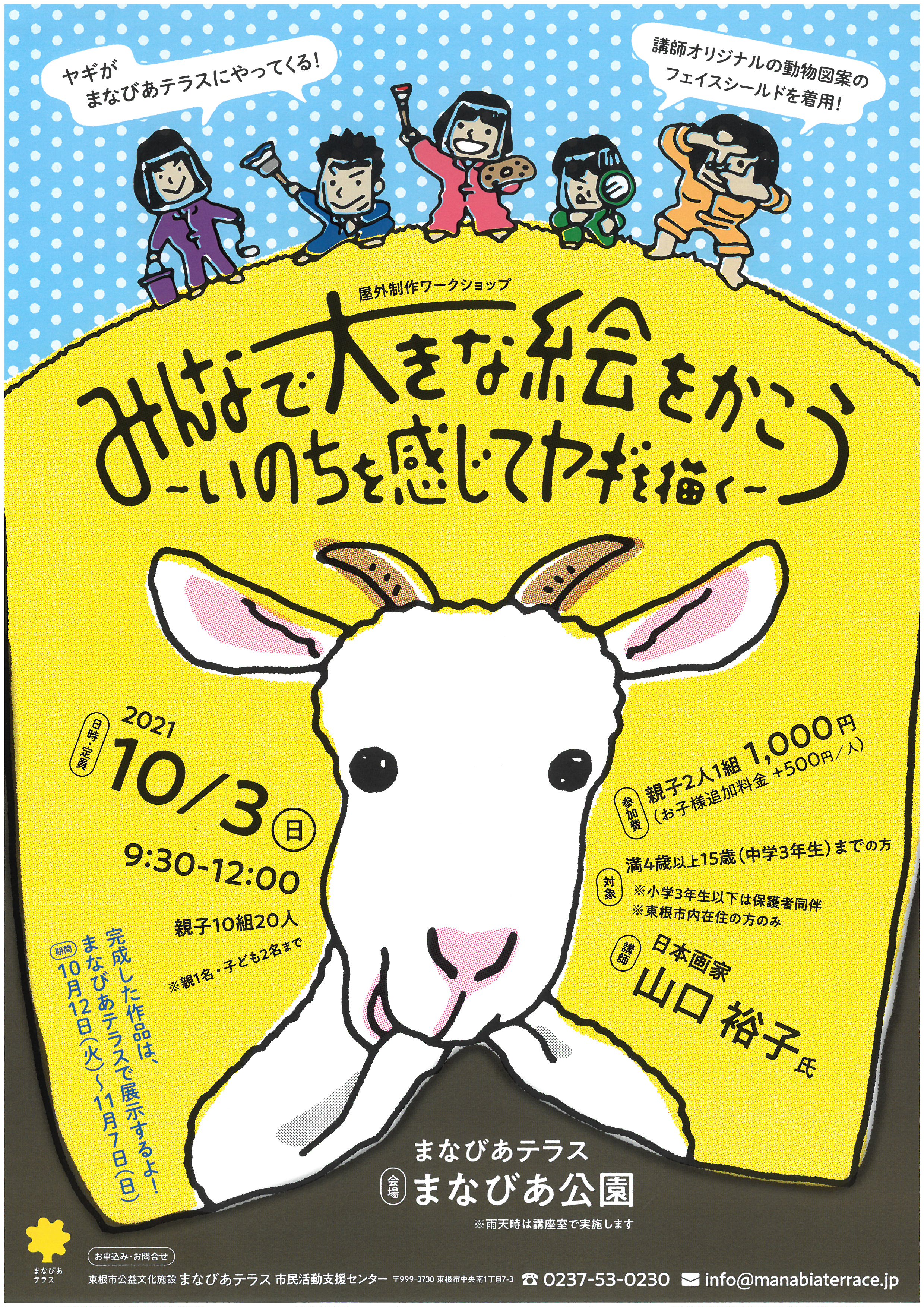 « すべてのイベント このイベントは終了しました。 みんなで大きな絵をかこう~いのちを感じてヤギを描く~ 2021年10月3日09:30 - 12:00 1000 « 2021年度まいど(毎週土曜日)おなじみの山形元気づくり創業塾 基礎知識と効率化のノウハウを学び、改善につながる「NPO会計業務入門」[第2回] » チラシのダウンロードはこちらから(PDF) + Google カレンダー+ iCal エクスポート 詳細 日付: 2021年10月3日 時間: 09:30 - 12:00 参加費: 1000 イベントカテゴリー: 団体主催 Web サイト: https://www.manabiaterrace.jp/event/support-center/minnade_ookinae2/ 主催者 東根市公益文化施設まなびあテラス 市民活動支援センター 電話番号: 0237-53-0230 会場 まなびあテラス