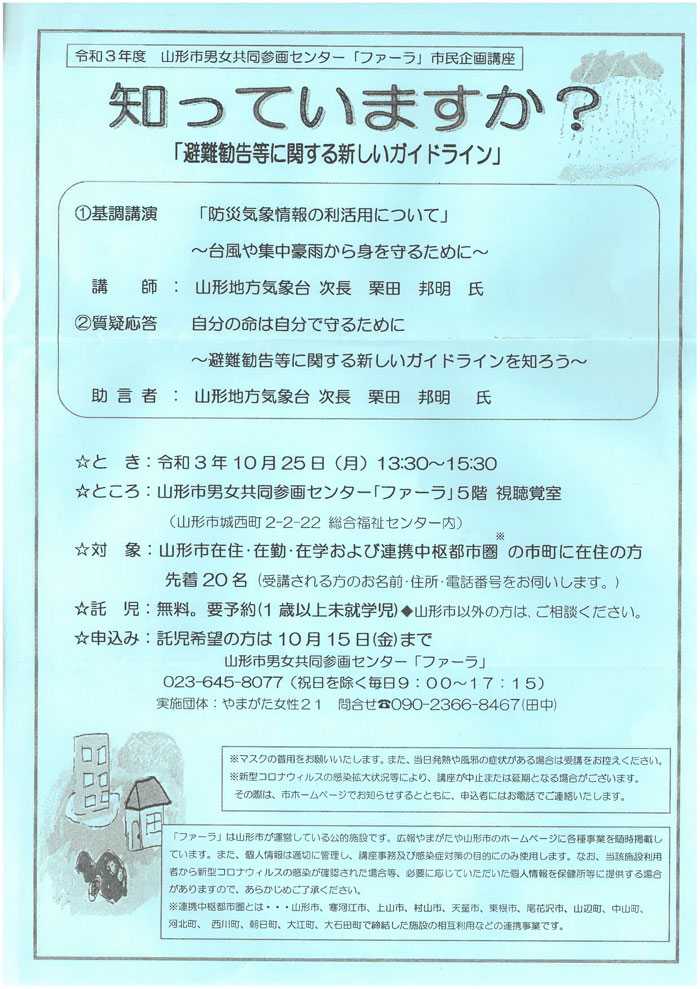 « すべてのイベント このイベントは終了しました。 知っていますか?「避難勧告等に関する新しいガイドライン」 2021年10月25日13:30 - 15:30 « ふらっとに集合!みんなで話題のゲームを体験しよう! 地域食堂「楽(らく)」 » チラシはこちらからダウンロードできます(PDF形式) + Google カレンダー+ iCal エクスポート 詳細 日付: 2021年10月25日 時間: 13:30 - 15:30 イベントカテゴリー: 団体主催 主催者 山形市男女共同参画センター ファーラ 電話番号: 023-645-8077 会場 山形市男児共同参画センター「ファーラ」 5F 視聴覚室 城西町2ー2ー22 山形市, 山形県 990-0832 + Google マップ 電話番号: 023-645-8077