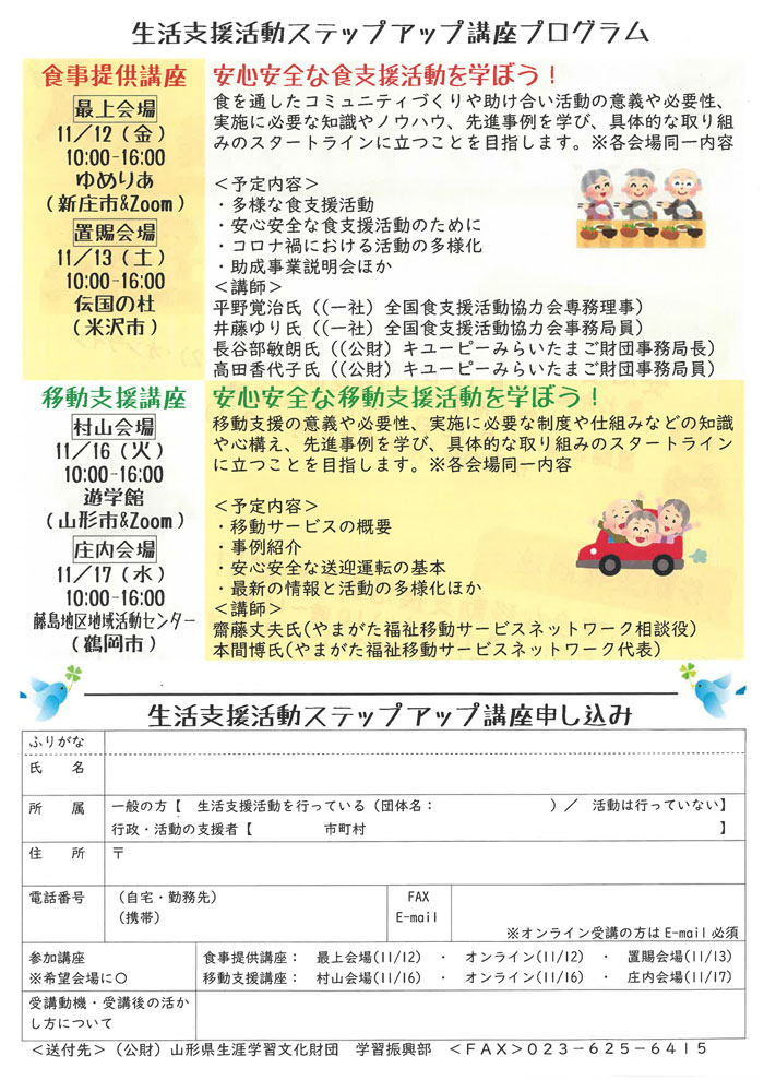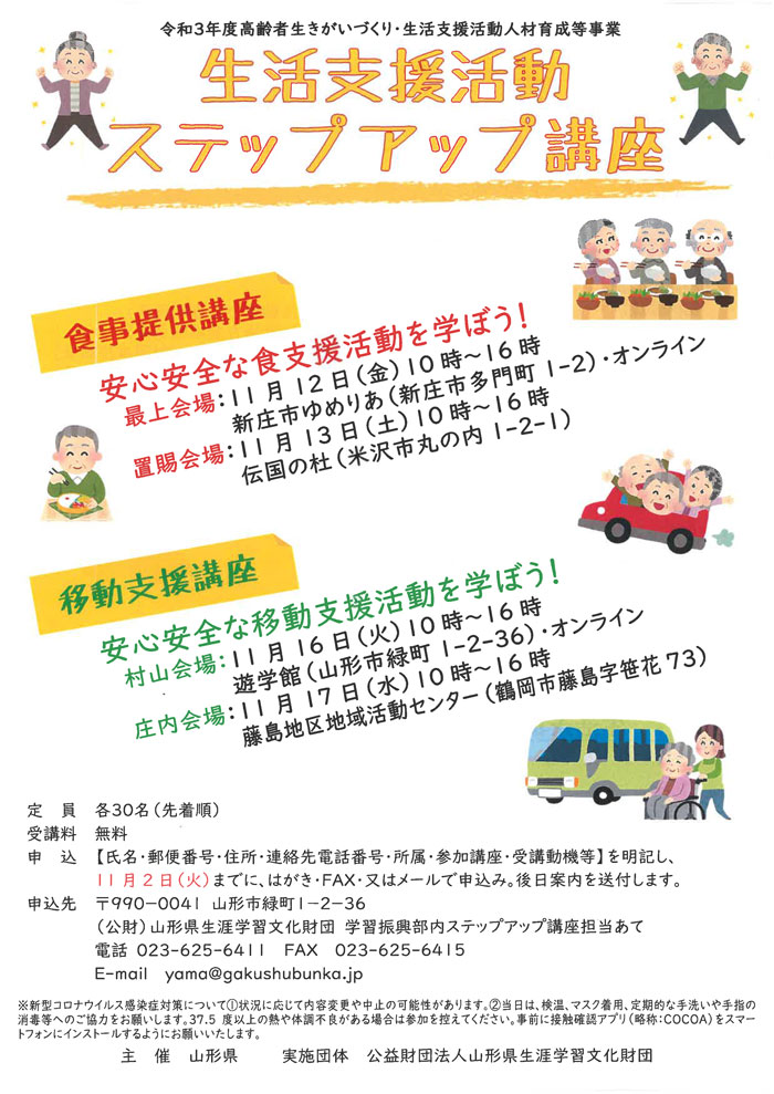 « すべてのイベント このイベントは終了しました。 生活支援活動ステップアップ講座 村山会場 2021年11月16日10:00 - 16:00 « 保育現場 復帰講座 保育現場 復帰講座 » チラシはこちらからダウンロードできます(PDF形式) + Google カレンダー+ iCal エクスポート 詳細 日付: 2021年11月16日 時間: 10:00 - 16:00 イベントカテゴリー: 団体主催 主催者 山形県 山形県生涯学習文化財団 会場 山形県生涯学習センター遊学館 緑町1-2-36 山形市, 山形県 9900041 + Google マップ