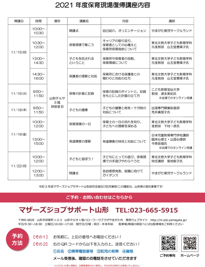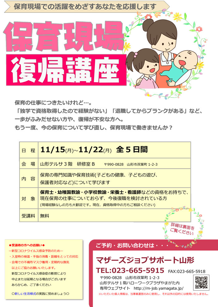 « すべてのイベント このイベントは終了しました。 保育現場 復帰講座 2021年11月22日10:00 - 13:00 « 音楽ひろば ぺんたとおん 大人こそ学びましょう!文部科学省『生命の安全教育』とは? » チラシはこちらからダウンロードできます(PDF形式) + Google カレンダー+ iCal エクスポート 詳細 日付: 2021年11月22日 時間: 10:00 - 13:00 イベントカテゴリー: 団体主催 主催者 マザーズジョブサポート山形 電話番号: 023-665-5915 Web サイト: http://m-job.yamagata.jp/ 会場 山形テルサ3階 研修室B 双葉町1-2-3 山形市, 山形県 9900828 日本 + Google マップ