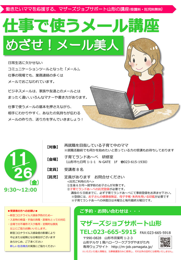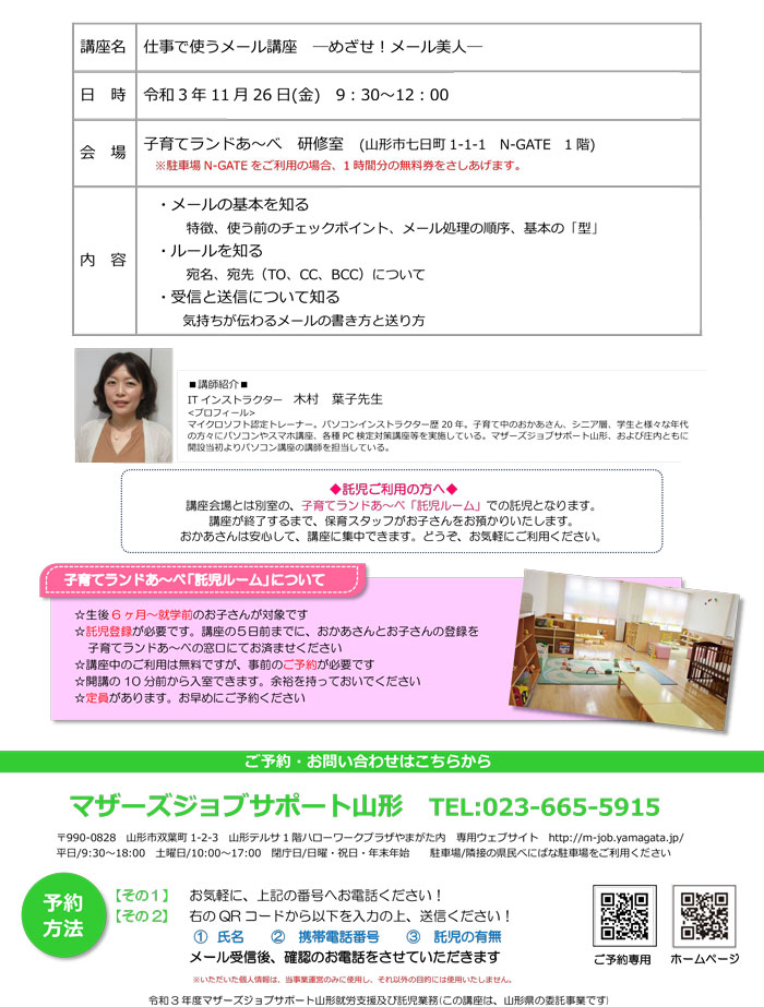 « すべてのイベント このイベントは終了しました。 仕事で使うメール講座 めざせ!メール美人 2021年11月26日09:30 - 12:00 « DVを知り考えよう~私らしく生きるために~ 脱炭素経営セミナーinやまがた【山形会場】 » チラシはこちらからダウンロードできます(PDF形式) + Google カレンダー+ iCal エクスポート 詳細 日付: 2021年11月26日 時間: 09:30 - 12:00 イベントカテゴリー: 団体主催 主催者 マザーズジョブサポート山形 電話番号: 023-665-5915 Web サイト: http://m-job.yamagata.jp/ 会場 子育てランドあ~べ 研修室 山形県山形市七日町1-1-1 N-GATE 1階 + Google マップ 電話番号: 023-615-1930