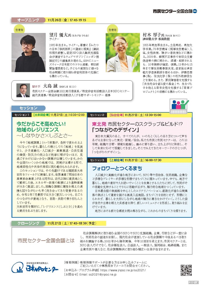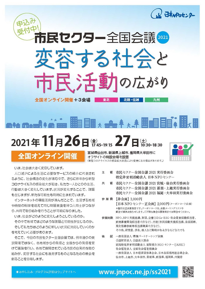 « すべてのイベント このイベントは終了しました。 市民セクター全国会議2021 変容する社会と市民活動の広がり 2021年11月26日17:45 - 19:15 « NPOなんでも相談会 市民セクター全国会議2021 変容する社会と市民活動の広がり » チラシはこちらからダウンロードできます(PDF形式) + Google カレンダー+ iCal エクスポート 詳細 日付: 2021年11月26日 時間: 17:45 - 19:15 イベントカテゴリー: 団体主催 Web サイト: https://www.jnpoc.ne.jp/ss2021/ 会場 (オンライン開催) 主催者 認定NPO法人日本NPOセンター Web サイト: https://www.jnpoc.ne.jp/