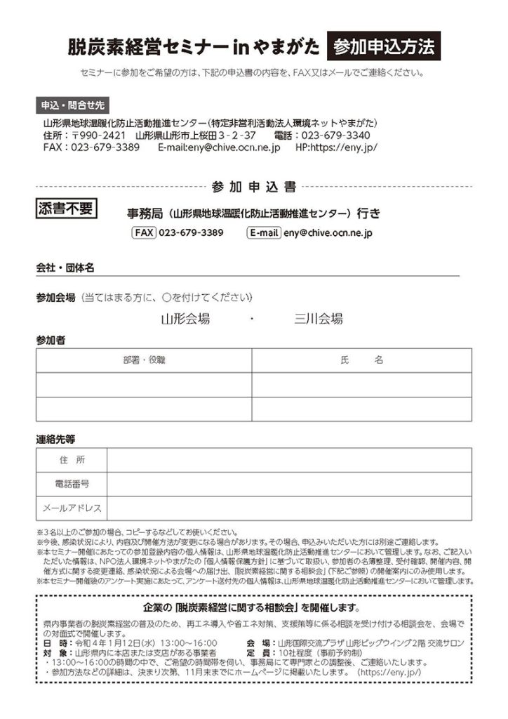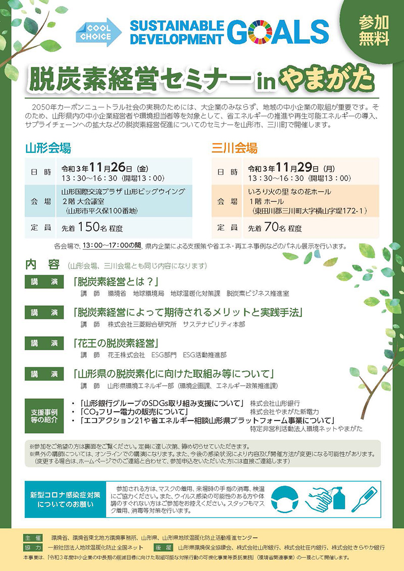 « すべてのイベント このイベントは終了しました。 脱炭素経営セミナーinやまがた【山形会場】 2021年11月26日13:30 - 16:30 « 仕事で使うメール講座 めざせ!メール美人 NPOなんでも相談会 » チラシはこちらよりダウンロードできます(PDF形式) + Google カレンダー+ iCal エクスポート 詳細 日付: 2021年11月26日 時間: 13:30 - 16:30 イベントカテゴリー: 団体主催 Web サイト: http://eny.jp/documents/chirashi_038.pdf 主催者 NPO法人環境ネットやまがた(山形県地球温暖化防止活動推進センター) 電話番号: 023-679-3340 メール: eny@chive.ocn.ne.jp Web サイト: https://eny.jp/ 会場 山形国際交流プラザ 山形ビックウイング 2階大会議室 平久保100番地 山形市, 山形県 990-0076 + Google マップ