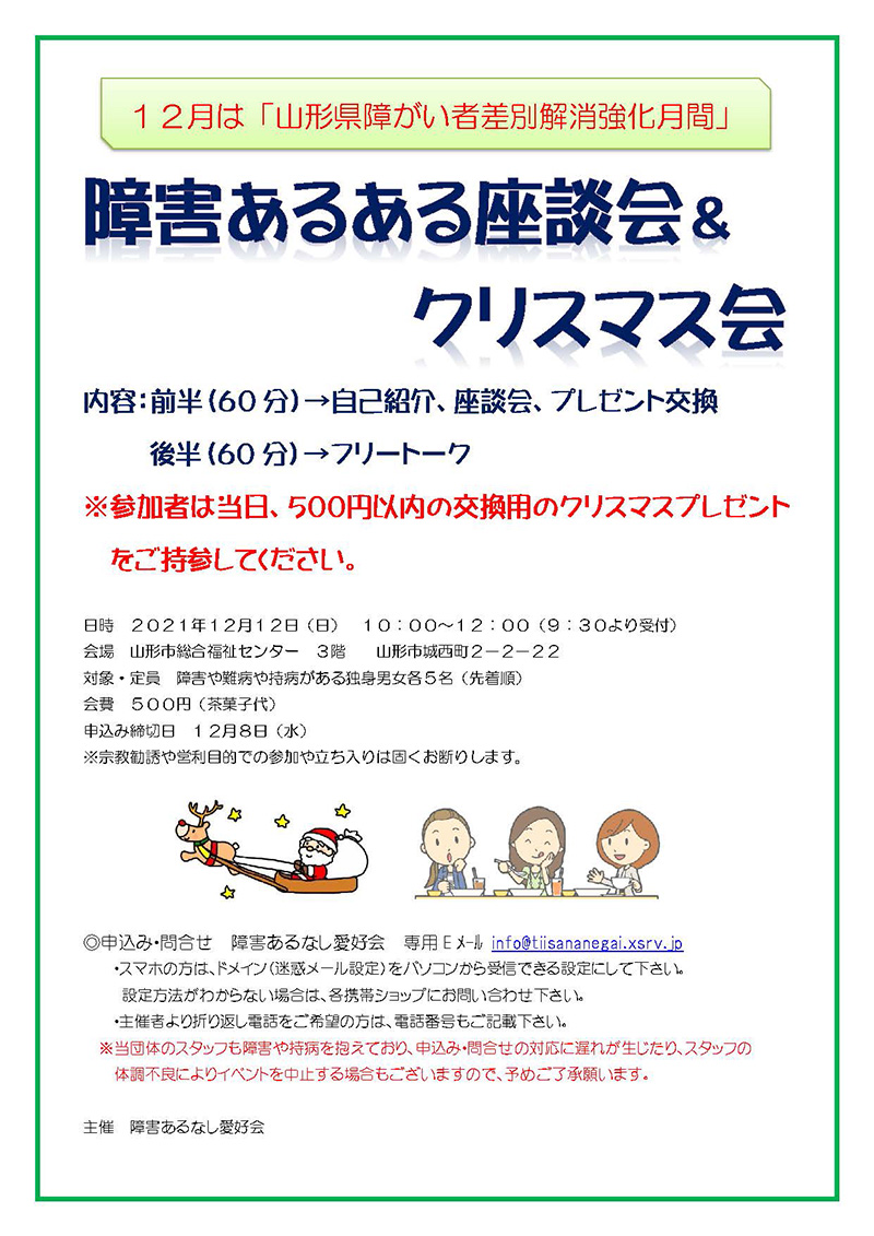 « すべてのイベント このイベントは終了しました。 障害あるある座談会&クリスマス会 2021年12月12日10:00 - 12:00 « 石原達也「まちの中間支援の仕事と自由と可能性。社会を編集する目線。」 福祉のまちづくりフェア2021 「対話でつながる福祉の未来」 » チラシはこちらよりダウンロードできます(PDF形式) + Google カレンダー+ iCal エクスポート 詳細 日付: 2021年12月12日 時間: 10:00 - 12:00 イベントカテゴリー: 団体主催 会場 山形市総合福祉センター 3階 山形市城西町2-2-22 + Google マップ