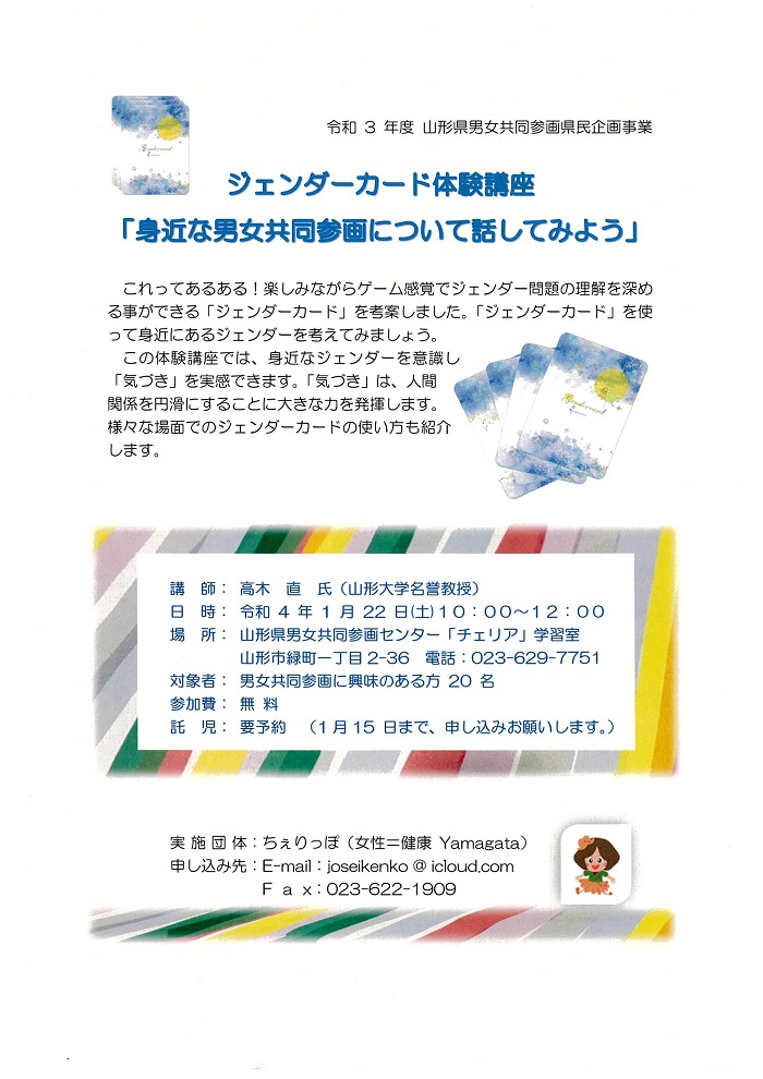 « すべてのイベント このイベントは終了しました。 ジェンダーカード体験講座「身近な男女共同参画について話してみよう」 2022年1月22日10:00 - 12:00 無料 « パソコンお悩み相談室(ワード、エクセル等) エクステンションぷらす ~まだまだ学び足りない大人達へ、山形大学が贈る新たなカタチの社会人向け講座~ » チラシはこちらからダウンロードできます(PDF形式) + Google カレンダー+ iCal エクスポート 詳細 日付: 2022年1月22日 時間: 10:00 - 12:00 参加費: 無料 イベントカテゴリー: 団体主催 主催者 ちぇりっぽ(女性=健康Yamagata) 電話番号: 023-622-1909(Fax) メール: cherippo@eneweb.net 会場 山形県男女共同参画センター チェリア 山形県山形市緑町1丁目2番36号 + Google マップ 電話番号: 023-629-7751 Web サイト: https://yamagata-cheria.org/