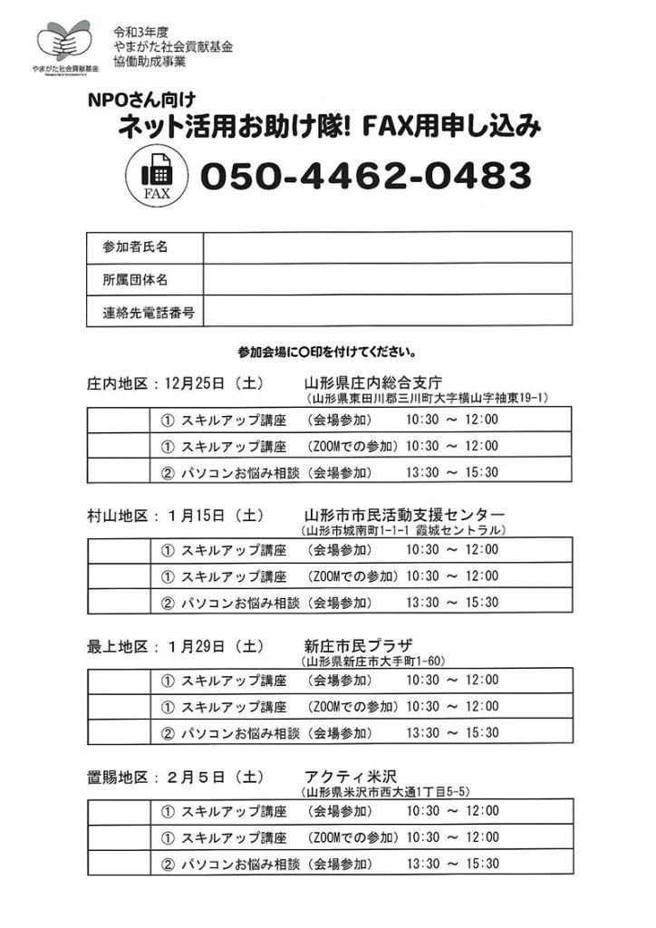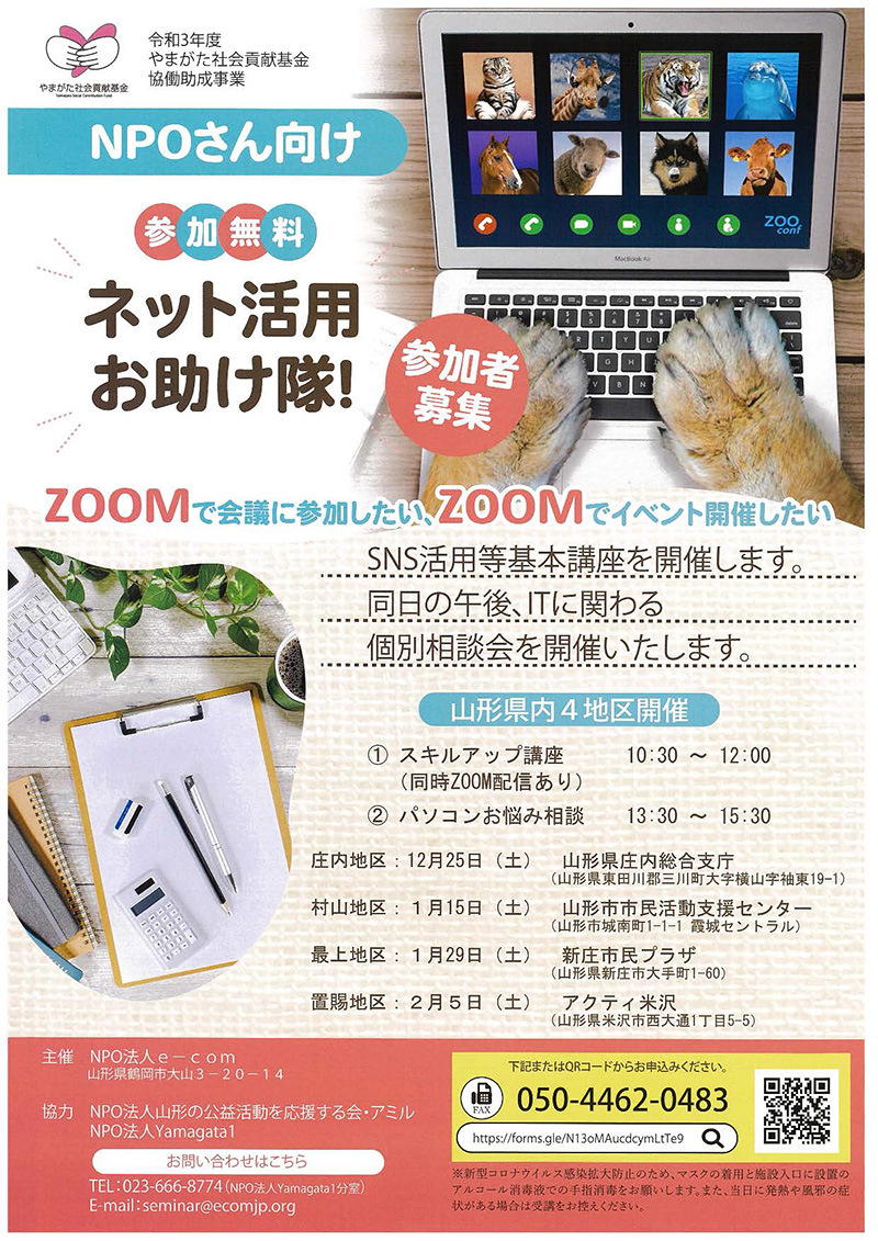 « すべてのイベント このイベントは終了しました。 NPOさん向け ネット活用お助け隊!(村山地区) 2022年1月15日10:30 - 15:30 « 地域食堂「楽(らく)」 野良猫の相談会 » チラシはこちらからダウンロードできます(PDF形式) + Google カレンダー+ iCal エクスポート 詳細 日付: 2022年1月15日 時間: 10:30 - 15:30 イベントカテゴリー: 団体主催 主催者 NPO法人 e-com 会場 山形市市民活動支援センター 山形市城南町1-1-1 霞城セントラル22階 + Google マップ