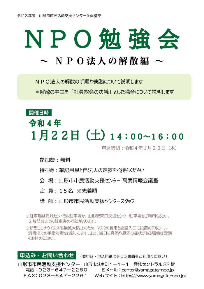 « すべてのイベント このイベントは終了しました。 NPO勉強会 ~NPO法人の解散編~ 2022年1月22日14:00 - 16:00 無料 « 省エネ(断熱)相談 まなびあテラス市民活動支援講座 グラフィックレコーディングを学んでみよう! » チラシのダウンロード(PDF) 申込書のダウンロード(PDF・word) + Google カレンダー+ iCal エクスポート 詳細 日付: 2022年1月22日 時間: 14:00 - 16:00 参加費: 無料 イベントカテゴリー: センター主催 主催者 山形市市民活動支援センター 電話番号: 023-647-2260 Web サイト: https://www.yamagata-npo.jp/ 会場 山形市市民活動支援センター 23階 高度情報会議室 山形市城南町1-1-1 霞城セントラル23階 山形市, 山形県 9908580 日本 + Google マップ
