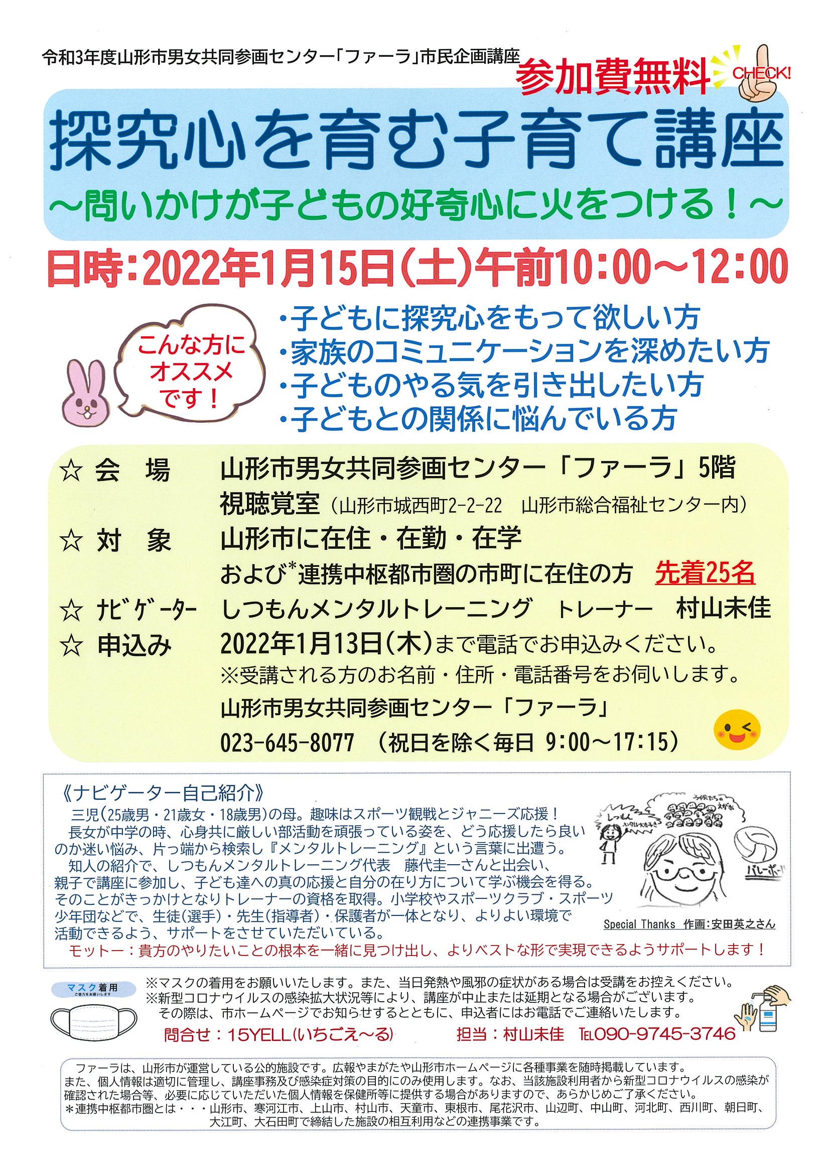 « すべてのイベント このイベントは終了しました。 探究心を育む子育て講座 ~問いかけが子どもの好奇心に火をつける!~ 2022年1月15日10:00 - 12:00 « センターで気軽にボランティア 地域食堂「楽(らく)」 » チラシのダウンロードはこちらから(PDF) + Google カレンダー+ iCal エクスポート 詳細 日付: 2022年1月15日 時間: 10:00 - 12:00 イベントカテゴリー: 団体主催 主催者 15YELL(いちごえ~る) 電話番号: 090-9745-3746(村山) メール: 15yell.yamagata@gmail.com 会場 山形市男女共同参画センター ファーラ 5階 視聴覚室 山形県山形市城西町2-2-22 山形市総合福祉センター内 山形市, 山形県 9900832 日本 + Google マップ