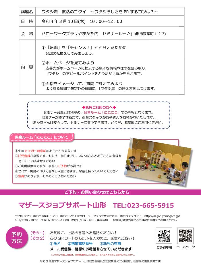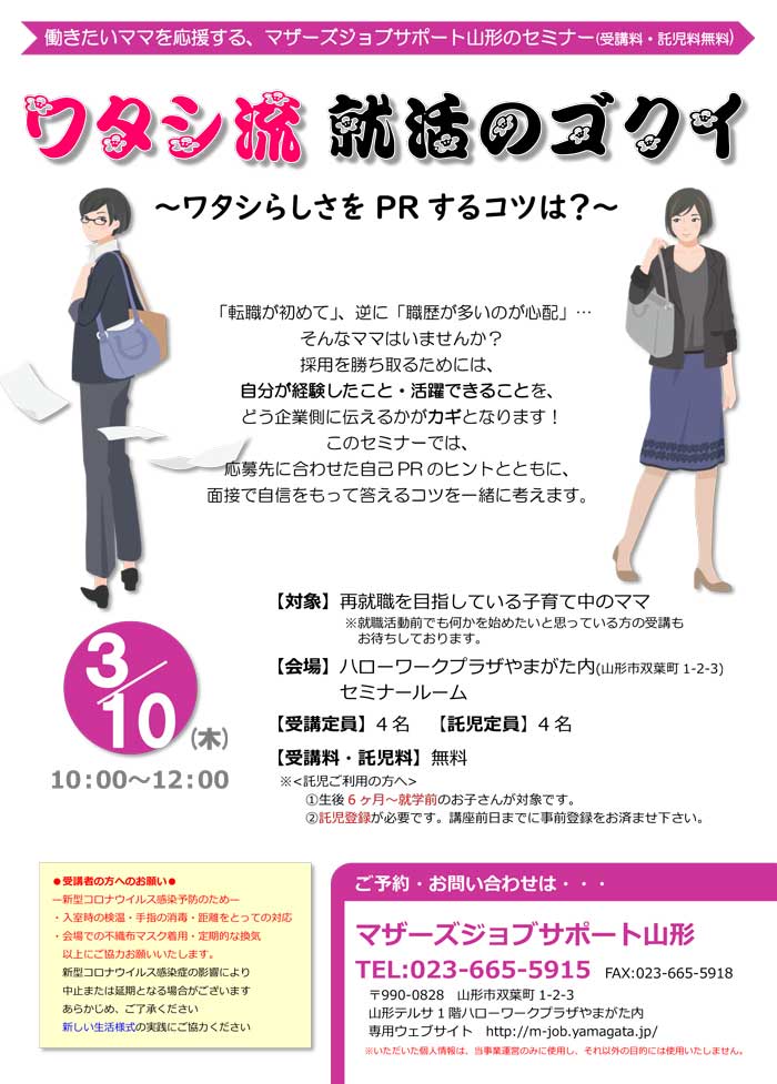 « すべてのイベント このイベントは終了しました。 ワタシ流就活のゴクイ~ワタシらしさをPRするコツは?~ 2022年3月10日10:00 - 12:00 « 第6回 哲学カフェ Salon de Yamagata はじめての方も安心!基本のZoom講座 » チラシはこちらからダウンロード出来ます(PDF形式) + Google カレンダー+ iCal エクスポート 詳細 日付: 2022年3月10日 時間: 10:00 - 12:00 イベントカテゴリー: 団体主催 主催者 マザーズジョブサポート山形 電話番号: 023-665-5915 Web サイト: http://m-job.yamagata.jp/ 会場 ハローワークプラザやまがた内 セミナールーム 双葉町1-2-3 山形市, 山形県 9900828 + Google マップ