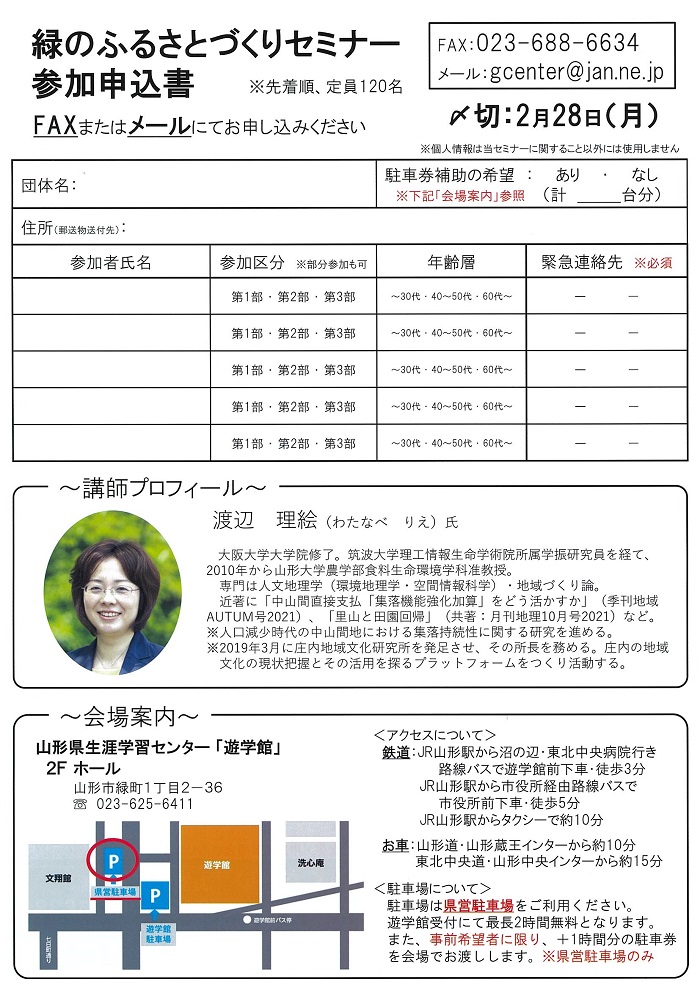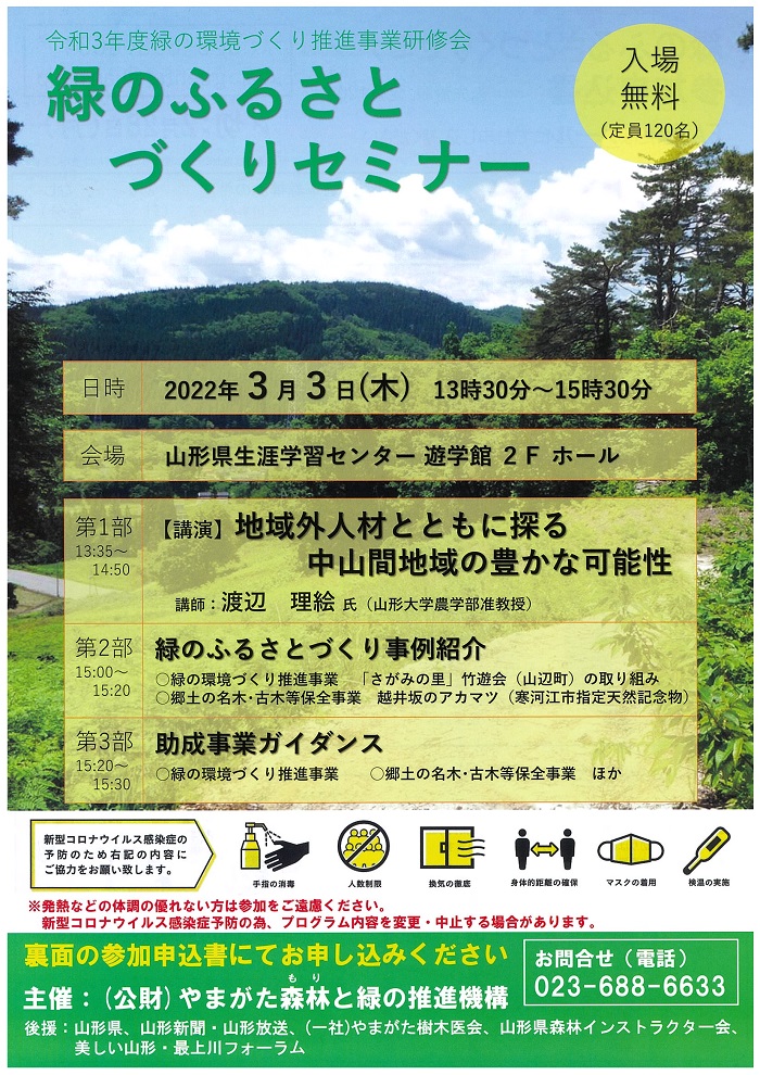 « すべてのイベント このイベントは終了しました。 緑のふるさとづくりセミナー 2022年3月3日13:30 - 15:30 « 令和3年度ファーラ主催事業 DV防止講座③ 夫婦間のコミュニケ―ションと子どもへの影響 令和3年度 山形市男女共同参画センター「ファーラ」 女性学講座① メディアが映し出すジェンダー・バイアス ~情報を読み解く力をつけよう~ » チラシはこちらからダウンロードできます(PDF形式) + Google カレンダー+ iCal エクスポート 詳細 日付: 2022年3月3日 時間: 13:30 - 15:30 イベントカテゴリー: 団体主催 主催者 (公財)やまがた森林と緑の推進機構 電話番号: 023-688-6633 メール: gcenter@jan.ne.jp Web サイト: http://ymidori.or.jp/index.html 会場 山形県生涯学習センター 遊学館 2Fホール 緑町1丁目2ー26 山形市, + Google マップ 電話番号: 023-625-6411