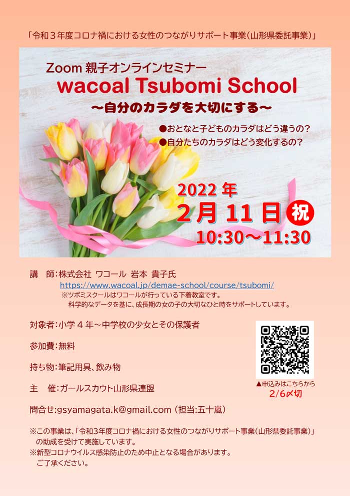 « すべてのイベント このイベントは終了しました。 Zoom 親子オンラインセミナー wacoal Tsubomi School ~自分のカラダを大切にする~ 2022年2月11日10:30 - 11:30 « 地域のSDGs実践者に聞く(外国人共生の未来) 2021年度 山形大学地域連携プラットフォーム 構築プロジェクト キックオフフォーラム » チラシはこちらからダウンロードできます(PDF) + Google カレンダー+ iCal エクスポート 詳細 日付: 2022年2月11日 時間: 10:30 - 11:30 イベントカテゴリー: 団体主催 Web サイト: https://www.wacoal.jp/demae-school/course/tsubomi/flow/index.html 主催者 ガールスカウト山形県連盟 電話番号: 023-623-8909(FAX兼用 月曜10時~12時)) Web サイト: http://gs-yamagata.sakura.ne.jp 会場 (オンライン開催)