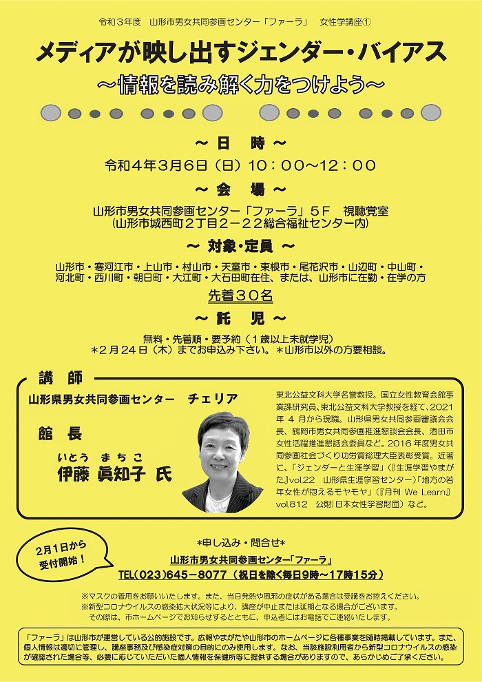 « すべてのイベント このイベントは終了しました。 令和3年度 山形市男女共同参画センター「ファーラ」 女性学講座① メディアが映し出すジェンダー・バイアス ~情報を読み解く力をつけよう~ 2022年3月6日10:00 - 12:00 « 緑のふるさとづくりセミナー 市民の出版物展”記念講座「クオリティオブライフの羅針盤(自分史の視点から) » チラシはこちらからダウンロードできます(PDF形式) + Google カレンダー+ iCal エクスポート 詳細 日付: 2022年3月6日 時間: 10:00 - 12:00 イベントカテゴリー: 団体主催 Web サイト: https://www.city.yamagata-yamagata.lg.jp/shiseijoho/kyodosankaku/1007047/1008979.html 主催者 山形市男女共同参画センター ファーラ 電話番号: 023-645-8077 会場 山形市男女共同参画センター 5階視聴覚室 山形市城西町2-2-22 山形市, + Google マップ