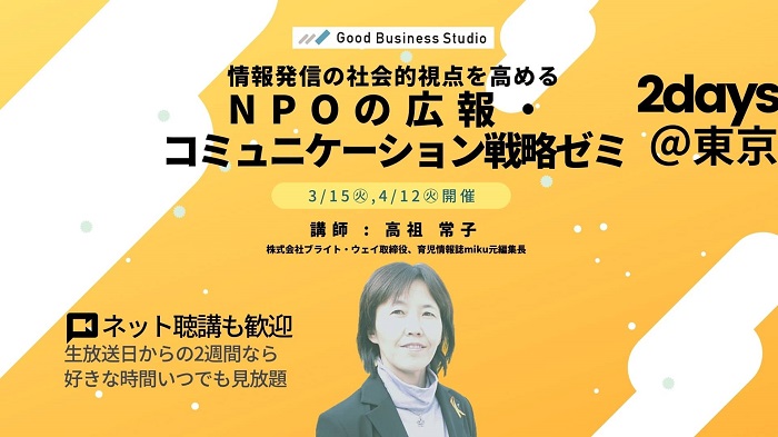 « すべてのイベント このイベントは終了しました。 情報発信の社会的視点を高める「NPOの広報・コミュニケーション戦略」ゼミ 2022年4月12日14:00 - 16:30 « 地域食堂「楽(らく)」 第7回 哲学カフェ Salon de Yamagata » ▼お申込み、詳細はこちらから https://npo-sc.org/training/good-business-studio/curriculum/ + Google カレンダー+ iCal エクスポート 詳細 日付: 2022年4月12日 時間: 14:00 - 16:30 イベントカテゴリー: 団体主催 Web サイト: https://npo-sc.org/training/good-business-studio/curriculum/21022/ 主催者 NPO法人 NPOサポートセンター 電話番号: 03-6453-7498 Web サイト: https://npo-sc.org/ 会場 (オンライン開催)