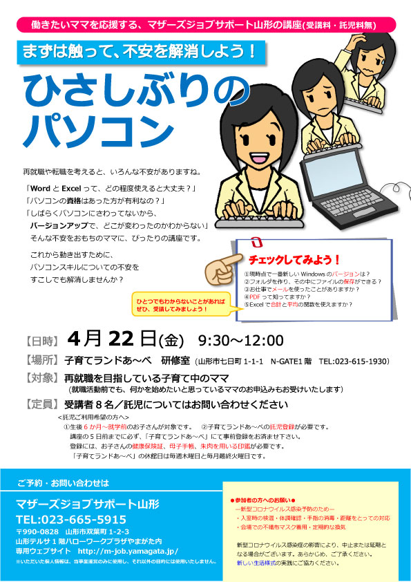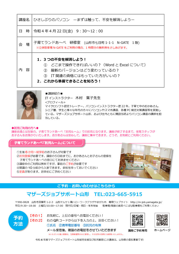 « すべてのイベント このイベントは終了しました。 PC講座「ひさしぶりのパソコン」 2022年4月22日09:30 - 12:00 « パソコンお悩み相談室 NPO勉強会~NPO入門編~ » チラシはこちらからダウンロードできます(PDF形式) + Google カレンダー+ iCal エクスポート 詳細 日付: 2022年4月22日 時間: 09:30 - 12:00 イベントカテゴリー: 団体主催 Web サイト: http://ikuji-land.jp/log/?l=512277 主催者 マザーズジョブサポート山形 電話番号: 023-665-5915 Web サイト: http://m-job.yamagata.jp/ 会場 子育てランドあ~べ 研修室 山形県山形市七日町1-1-1 N-GATE 1階 + Google マップ 電話番号: 023-615-1930