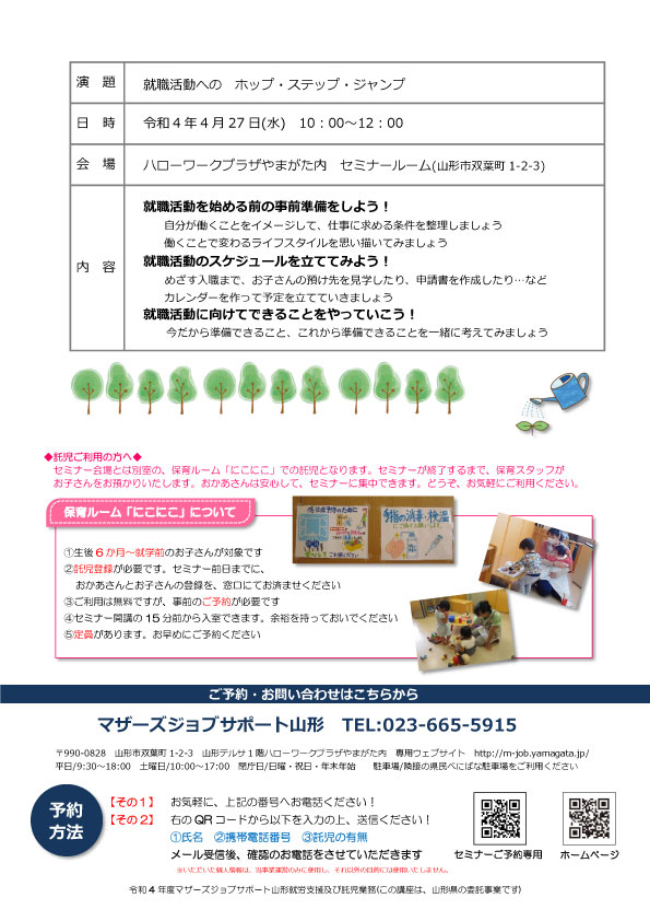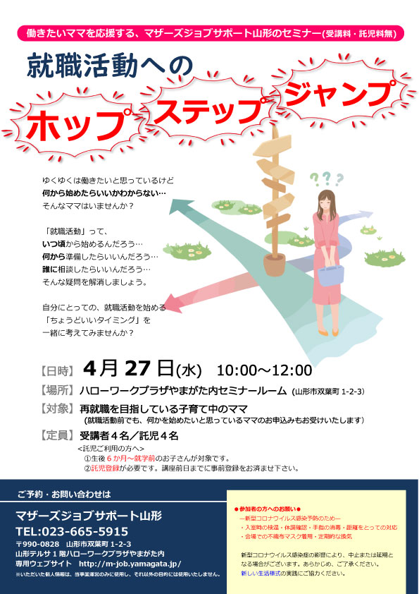 « すべてのイベント このイベントは終了しました。 「就職活動へのホップ・ステップ・ジャンプ」 2022年4月27日10:00 - 12:00 « 地域食堂「楽(らく)」 一箱古本市@山形 » チラシはこちらからダウンロードできます(PDF形式) + Google カレンダー+ iCal エクスポート 詳細 日付: 2022年4月27日 時間: 10:00 - 12:00 イベントカテゴリー: 団体主催 Web サイト: http://ikuji-land.jp/log/?l=512275 主催者 マザーズジョブサポート山形 電話番号: 023-665-5915 Web サイト: http://m-job.yamagata.jp/ 会場 ハローワークプラザやまがた内 セミナールーム 双葉町1-2-3 山形市, 山形県 9900828 + Google マップ