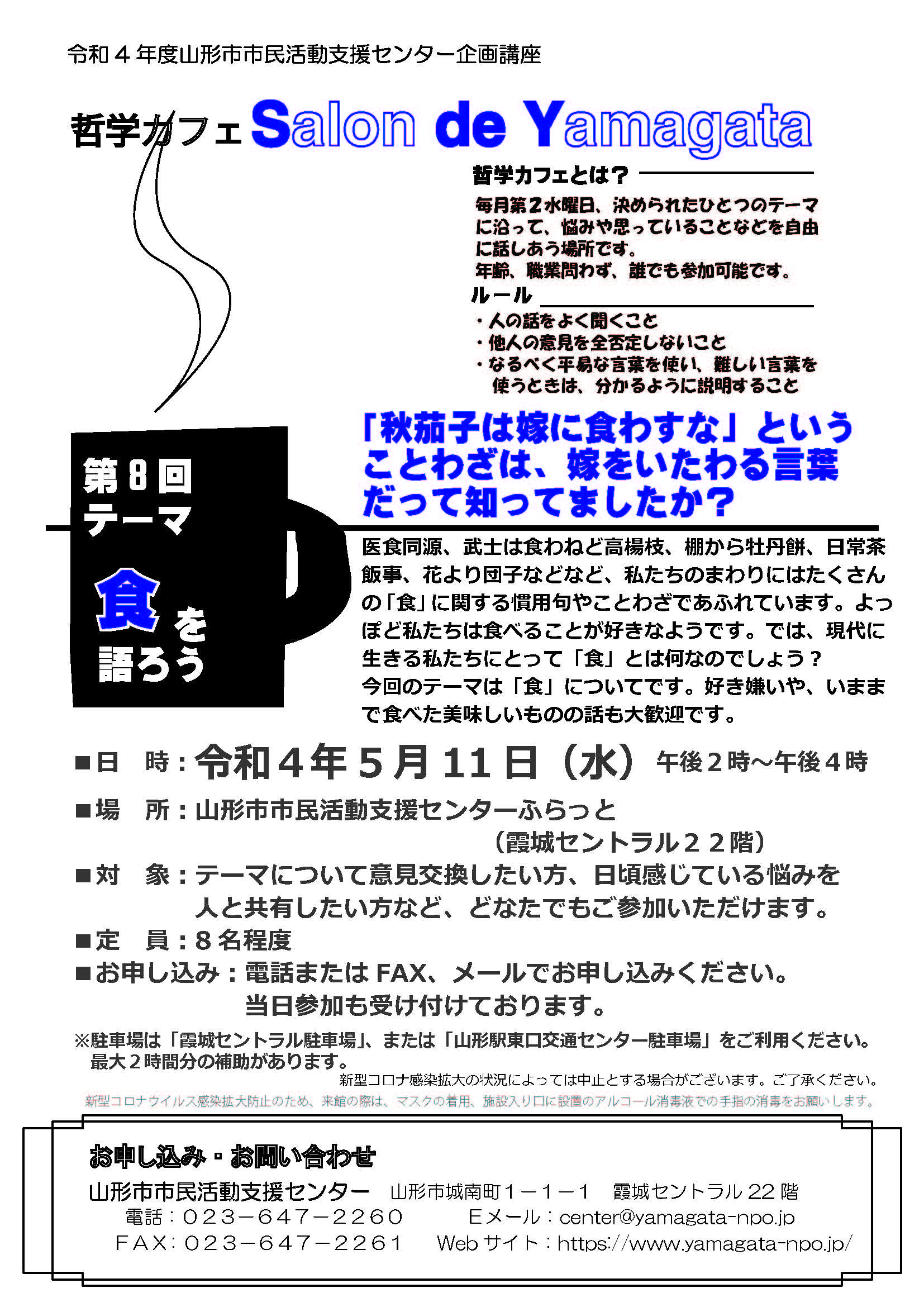 « すべてのイベント このイベントは終了しました。 第8回 哲学カフェ Salon de Yamagata 2022年5月11日14:00 - 16:00 無料 « 地域食堂「楽(らく)」 かたばみの会カフェでお話しませんか? » 第8回のテーマは「食を語ろう」です。 どなたでもご参加いただけます。 好き嫌いや、いままで食べた美味しいものの話も大歓迎です。 チラシはこちらからダウンロードできます(PDF) + Google カレンダー+ iCal エクスポート 詳細 日付: 2022年5月11日 時間: 14:00 - 16:00 参加費: 無料 イベントカテゴリー: センター主催 主催者 山形市市民活動支援センター 電話番号: 023-647-2260 Web サイト: https://www.yamagata-npo.jp/ 会場 山形市市民活動支援センター ふらっと+B会議室 山形市城南町1-1-1 山形市, 山形県 990-8580 日本 + Google マップ
