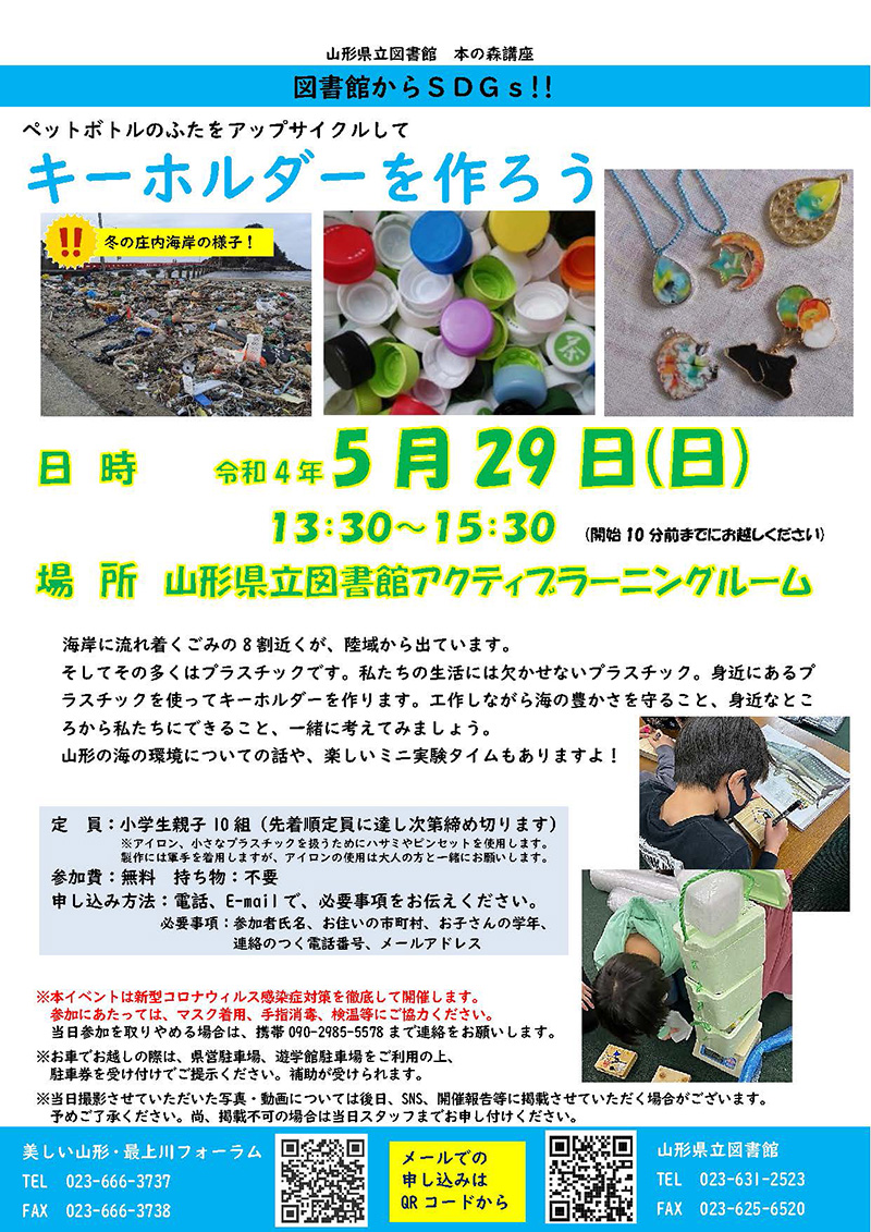 « すべてのイベント このイベントは終了しました。 図書館からSDGs!!ペットボトルのふたをアップサイクルしてキーホルダーを作ろう 2022年5月29日13:30 - 15:30 « 感謝を込めて香りのプレゼント~手づくりのフラワーポット~ 令和4年度 世界禁煙デー 山形福島合同イベント » 【変更】開催時間 13:30~15:30 最新の情報はこちらよりご確認ください。 チラシはこちらよりダウンロードできます(PDF形式) + Google カレンダー+ iCal エクスポート 詳細 日付: 2022年5月29日 時間: 13:30 - 15:30 イベントカテゴリー: 団体主催 Web サイト: http://www.mogamigawa.gr.jp/index.php?action=pages_view_main&active_action=journal_view_main_detail&post_id=405&comment_flag=1&block_id=282#_282 主催者 美しい山形・最上川フォーラム 電話番号: 023-666-3737 Web サイト: http://www.mogamigawa.gr.jp/ 会場 山形県立図書館 1階 アクティブラーニングルーム 緑町1-2-36 山形市, 990-0041 + Google マップ 電話番号: 023-631-2523