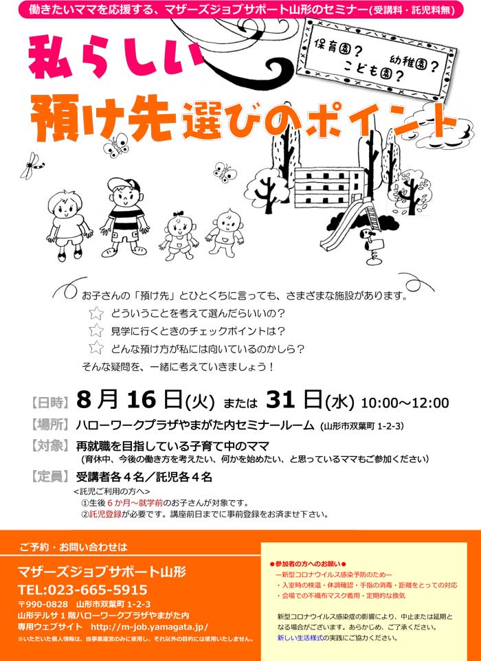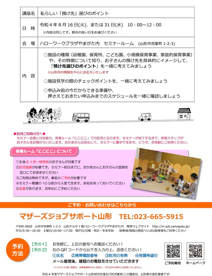 « すべてのイベント このイベントは終了しました。 私らしい預け先選びのポイント 2022年8月31日10:00 - 12:00 « 女性のためのこころのオンライン相談 集中相談 非営利団体向けSalesforce研修(中級) » チラシはこちらからダウンロードできます(PDF形式) + Google カレンダー+ iCal エクスポート 詳細 日付: 2022年8月31日 時間: 10:00 - 12:00 イベントカテゴリー: 団体主催 主催者 マザーズジョブサポート山形 電話番号: 023-665-5915 Web サイト: http://m-job.yamagata.jp/ 会場 ハローワークプラザやまがた内 セミナールーム 双葉町1-2-3 山形市, 山形県 9900828 + Google マップ