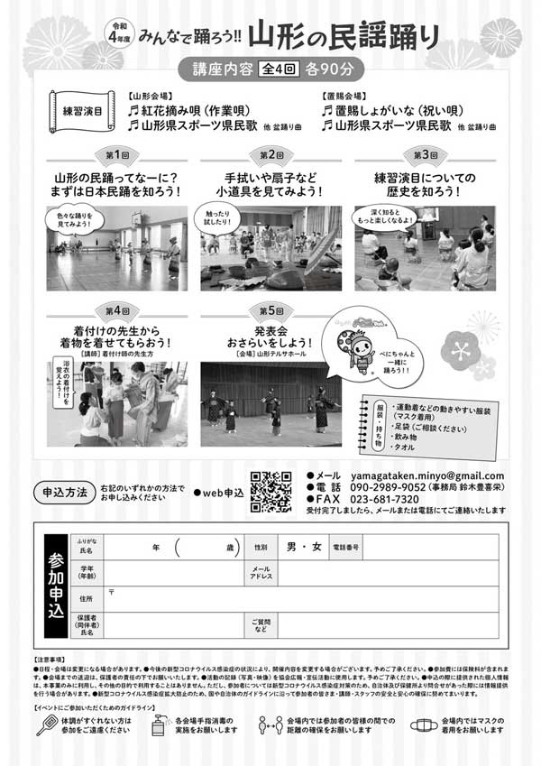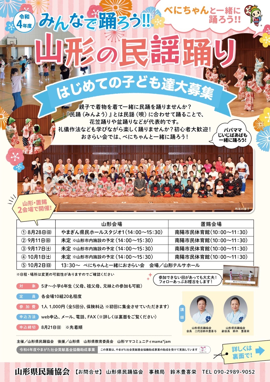« すべてのイベント このイベントは終了しました。 みんなで踊ろう!! 山形の民謡踊り 2022年8月28日14:00 - 15:30 1000 « 女性のためのこころのオンライン相談 集中相談 女性のためのこころのオンライン相談 集中相談 » チラシはこちらからダウンロードできます + Google カレンダー+ iCal エクスポート 詳細 日付: 2022年8月28日 時間: 14:00 - 15:30 参加費: 1000 イベントカテゴリー: 団体主催 主催者 山形県民踊協会 電話番号: 090-2989-9052 Web サイト: https://sites.google.com/view/yamagataken-minyo/home 会場 やまぎん県民ホール(山形県総合文化芸術館) 山形市双葉町1-2-38 山形市, + Google マップ 電話番号: 023-664-2220