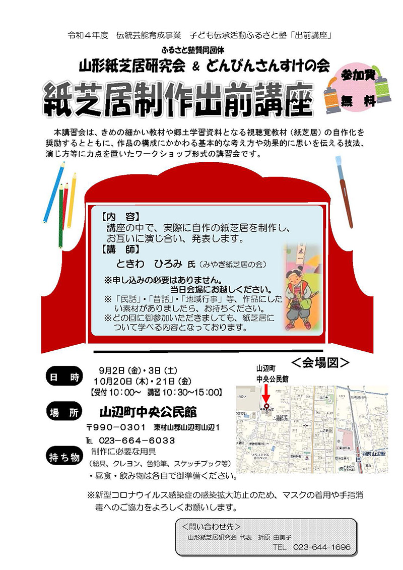 « すべてのイベント このイベントは終了しました。 山形紙芝居研究会&どんびんさんすけの会 紙芝居出前講座 2022年10月20日10:30 - 15:00 « やまがた女性キャリアアップセミナー ~ キャリアアップに必要なスキルを職場で活用できるようになる ~ NPO法人のための会計講座・個別相談会(最上開催) » チラシはこちらよりダウンロードできます(PDF形式) + Google カレンダー+ iCal エクスポート 詳細 日付: 2022年10月20日 時間: 10:30 - 15:00 イベントカテゴリー: 団体主催 主催者 山形紙芝居研究会 会場 山辺町中央公民館 東村山郡山辺町山辺1 山形県 023-664-6033 + Google マップ
