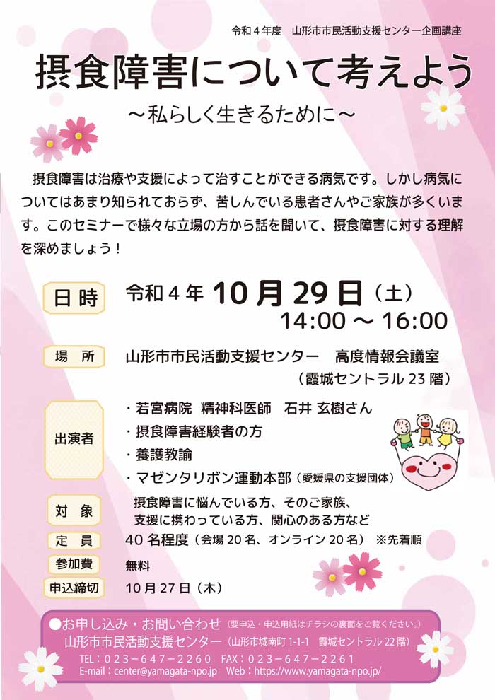 « すべてのイベント このイベントは終了しました。 摂食障害について考えよう~私らしく生きるために~ 2022年10月29日14:00 - 16:00 « まなびなおしの読書会 女性のエンパワメント講座 » チラシはこちらからダウンロードできます(PDF形式) + Google カレンダー+ iCal エクスポート 詳細 日付: 2022年10月29日 時間: 14:00 - 16:00 イベントカテゴリー: センター主催 主催者 山形市市民活動支援センター 会場 山形市市民活動支援センター 23階 高度情報会議室 山形市城南町1-1-1 霞城セントラル23階 山形市, 山形県 9908580 日本 + Google マップ