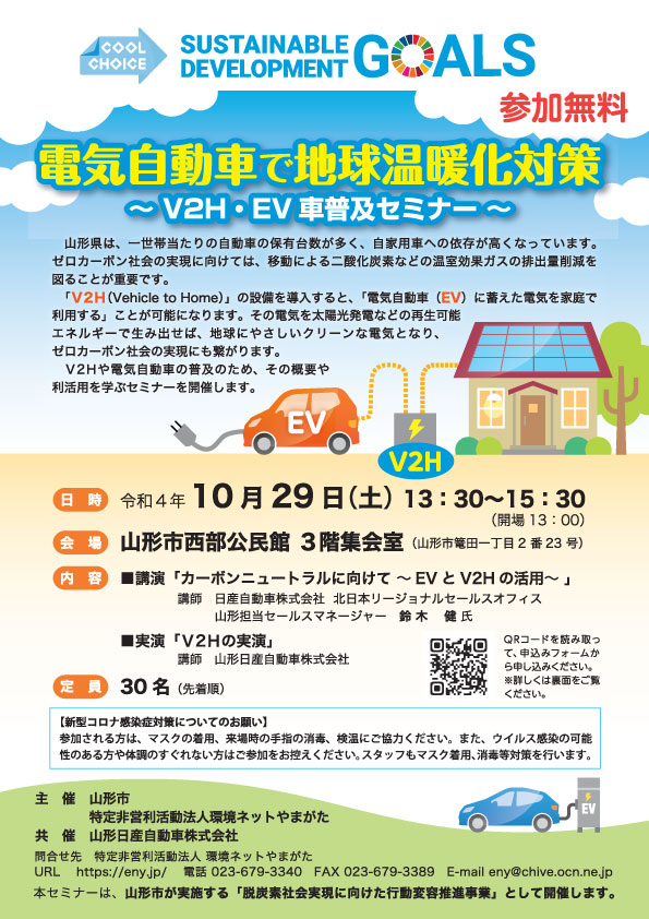 « すべてのイベント このイベントは終了しました。 電気自動車で地球温暖化対策~V2H・EV車普及セミナー~ 2022年10月29日13:30 - 15:30 « チェリア塾 基本コースin庄内 第5回 今日はゴールをスタートに変える日 まなびなおしの読書会 » チラシはこちらからダウンロードできます(PDF形式) + Google カレンダー+ iCal エクスポート 詳細 日付: 2022年10月29日 時間: 13:30 - 15:30 イベントカテゴリー: 団体主催 Web サイト: https://eny.jp/index.html 主催者 NPO法人 環境ネットやまがた 電話番号: 023-679-3340 メール: eny@chive.ocn.ne.jp Web サイト: https://eny.jp 会場 山形市西部公民館 3階集会室