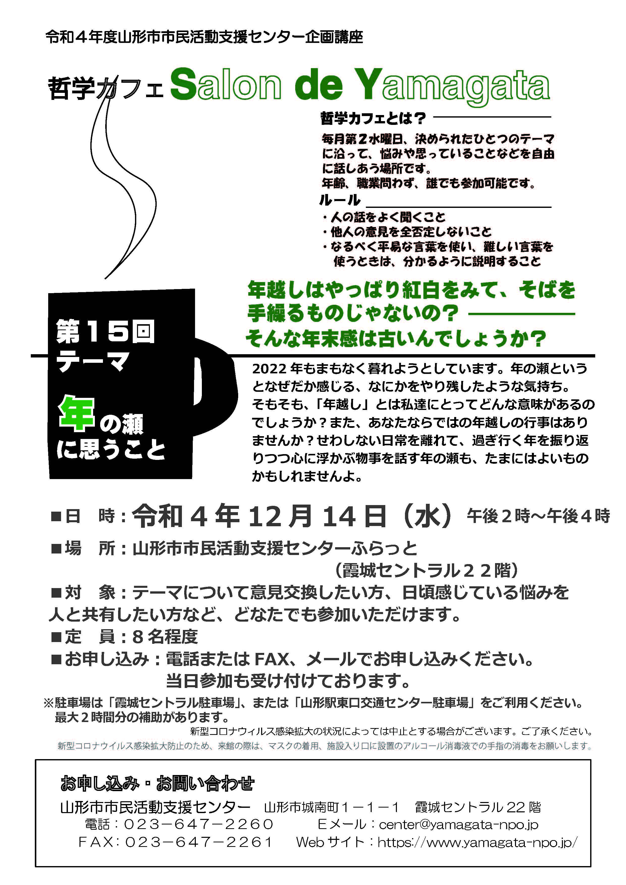 « すべてのイベント このイベントは終了しました。 第15回 哲学カフェ Salon de Yamagata 2022年12月14日14:00 - 16:00 無料 « NPOなんでも相談会 あなたも「とぴボラ」してみませんか? » 第15回のテーマは「年の瀬に思うこと」です。 どなたでもご参加いただけます。 あなたの年越しは、案外普通とは違うかもですよ。 チラシはこちらからダウンロードできます(PDF) + Google カレンダー+ iCal エクスポート 詳細 日付: 2022年12月14日 時間: 14:00 - 16:00 参加費: 無料 イベントカテゴリー: センター主催 イベント タグ: 哲学カフェ 主催者 山形市市民活動支援センター 電話番号: 023-647-2260 Web サイト: https://www.yamagata-npo.jp/ 会場 山形市市民活動支援センター ふらっと+B会議室 山形市城南町1-1-1 山形市, 山形県 990-8580 日本 + Google マップ