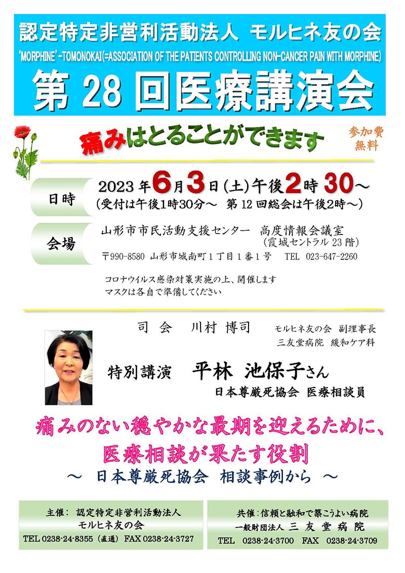 « すべてのイベント このイベントは終了しました。 認定特定非営利活動法人モルヒネ友の会 第28回医療講演会 2023年6月3日14:30 « 相談無料 女性のためのこころの相談~臨床心理士が相談をお受けします~オンライン スポGOMI in山形大学2023【米沢】 » チラシはこちらよりダウンロードできます(PDF形式) + Google カレンダー+ iCal エクスポート 詳細 日付: 2023年6月3日 時間: 14:30 イベントカテゴリー: 団体主催 主催者 認定特定非営利活動法人 モルヒネ友の会 メール: moruhinetomonokai@gmail.com 会場 山形市市民活動支援センター 23階 高度情報会議室 山形市城南町1-1-1 霞城セントラル23階 山形市, 山形県 9908580 日本 + Google マップ