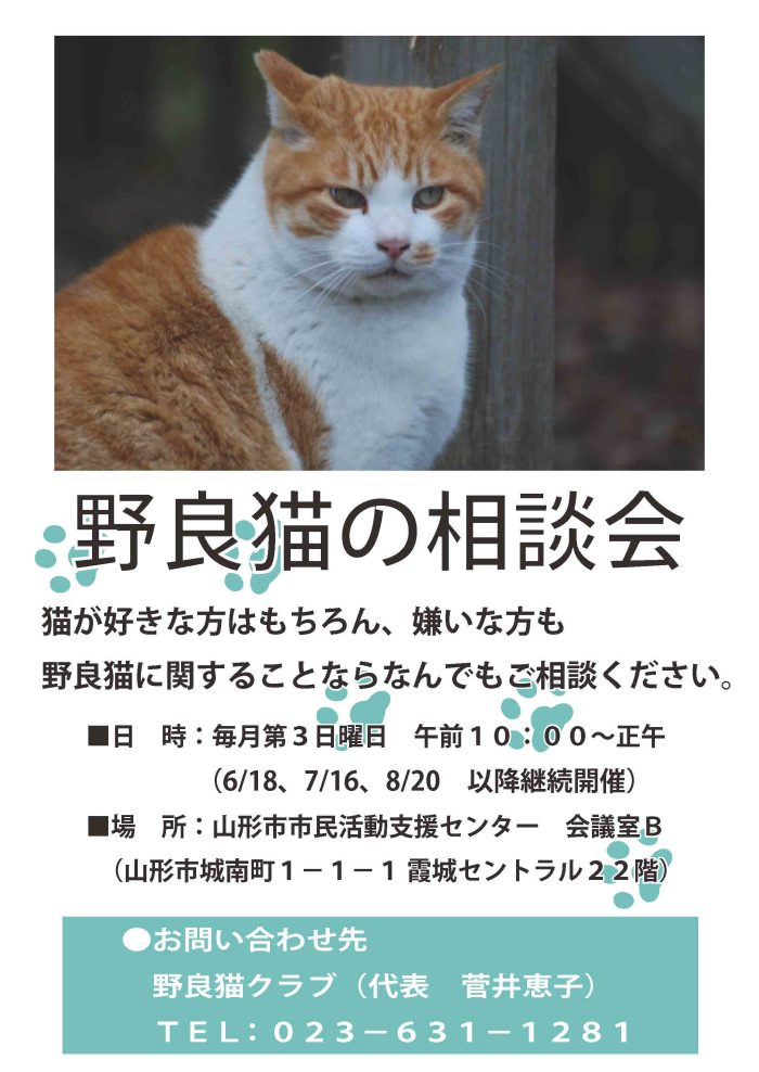 « すべてのイベント このイベントは終了しました。 野良猫の相談会 2023年7月16日10:00 - 12:00 無料 « あなたの「やる気」応援企画 初心者のためのふらっとNPO教室 みんなのテーブル 第一回「こんなテーマでおしゃべりしたい!」 » このチラシはこちらからダウンロードできます。(pdf形式) + Google カレンダー+ iCal エクスポート 詳細 日付: 2023年7月16日 時間: 10:00 - 12:00 参加費: 無料 イベントカテゴリー: 団体主催 主催者 野良猫クラブ 電話番号: 023-631-1281 会場 山形市市民活動支援センター 会議室B 城南町1-1-1 霞城セントラル 山形市, 山形県 9908580 日本 + Google マップ 電話番号: 023-647-2260