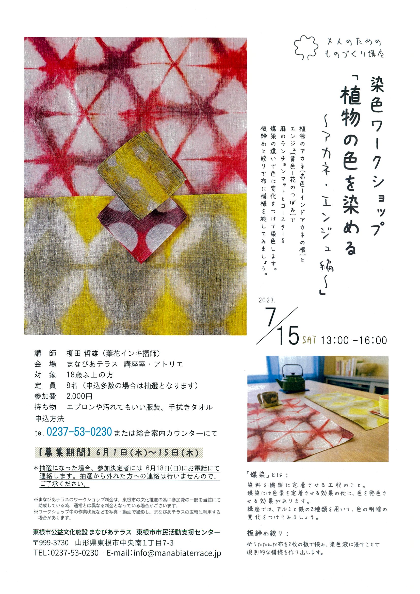 « すべてのイベント このイベントは終了しました。 染色ワークショップ「植物の色を染める~アカネ・エンジュ編~」 2023年7月15日13:00 - 16:00 2000 « 今更過ぎて聞けなかった! LINE活用講座 あなたの「やる気」応援企画 初心者のためのふらっとNPO教室 » チラシのダウンロードはこちらから(PDF) + Google カレンダー+ iCal エクスポート 詳細 日付: 2023年7月15日 時間: 13:00 - 16:00 参加費: 2000 イベントカテゴリー: 団体主催 会場 まなびあテラス