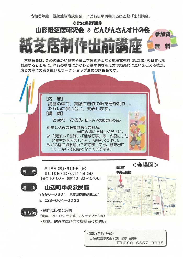 « すべてのイベント このイベントは終了しました。 山形紙芝居研究会&どんびんさんすけの会 紙芝居制作出前講座 2023年6月8日10:30 - 15:00 « フリースクールよつば&フリースクールいろは主催 ~チャリティーコンサート~ 佐山こうたソロピアノwit 小久保泰延ドラム Zoomの使い方講座 オンライン(Zoom)を体験してみませんか? 全3回 第2回「基本編」 » チラシはこちらからダウンロードできます(PDF形式) + Google カレンダー+ iCal エクスポート 詳細 日付: 2023年6月8日 時間: 10:30 - 15:00 イベントカテゴリー: 団体主催 主催者 山形紙芝居研究会 会場 山辺町中央公民館 東村山郡山辺町山辺1 山形県 023-664-6033 + Google マップ