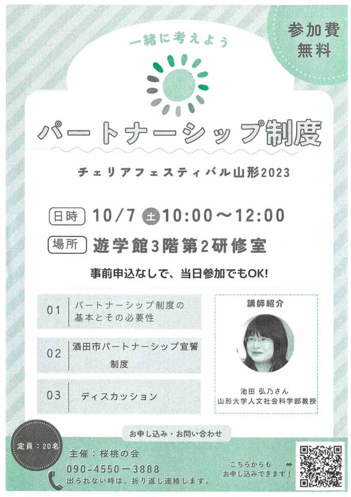 « すべてのイベント このイベントは終了しました。 パートナーシップ制度~チェリアフェスティバル山形2023~ 2023年10月7日10:00 - 12:00 « チェリアフェスティバル 山形2023 2023年度 山形元気づくり創業塾🔰①〈開講〉先輩起業家トークセッション 成功する創業の要件、心構え » チラシはこちらからダウンロードできます(PDF形式) + Google カレンダー+ iCal エクスポート 詳細 日付: 2023年10月7日 時間: 10:00 - 12:00 イベントカテゴリー: 団体主催 主催者 桜桃(チェリア)の会 -やまがた女塾- 電話番号: 023-622-6764 メール: nagaseco @amail.plala.or.jp 会場 遊学館 3階 第2研修室 山形市緑町1丁目2-36 山形市, 山形県 990-0041 日本 + Google マップ 電話番号: 023-625-6411 Web サイト: https://www.gakushubunka.jp/yugakukan/