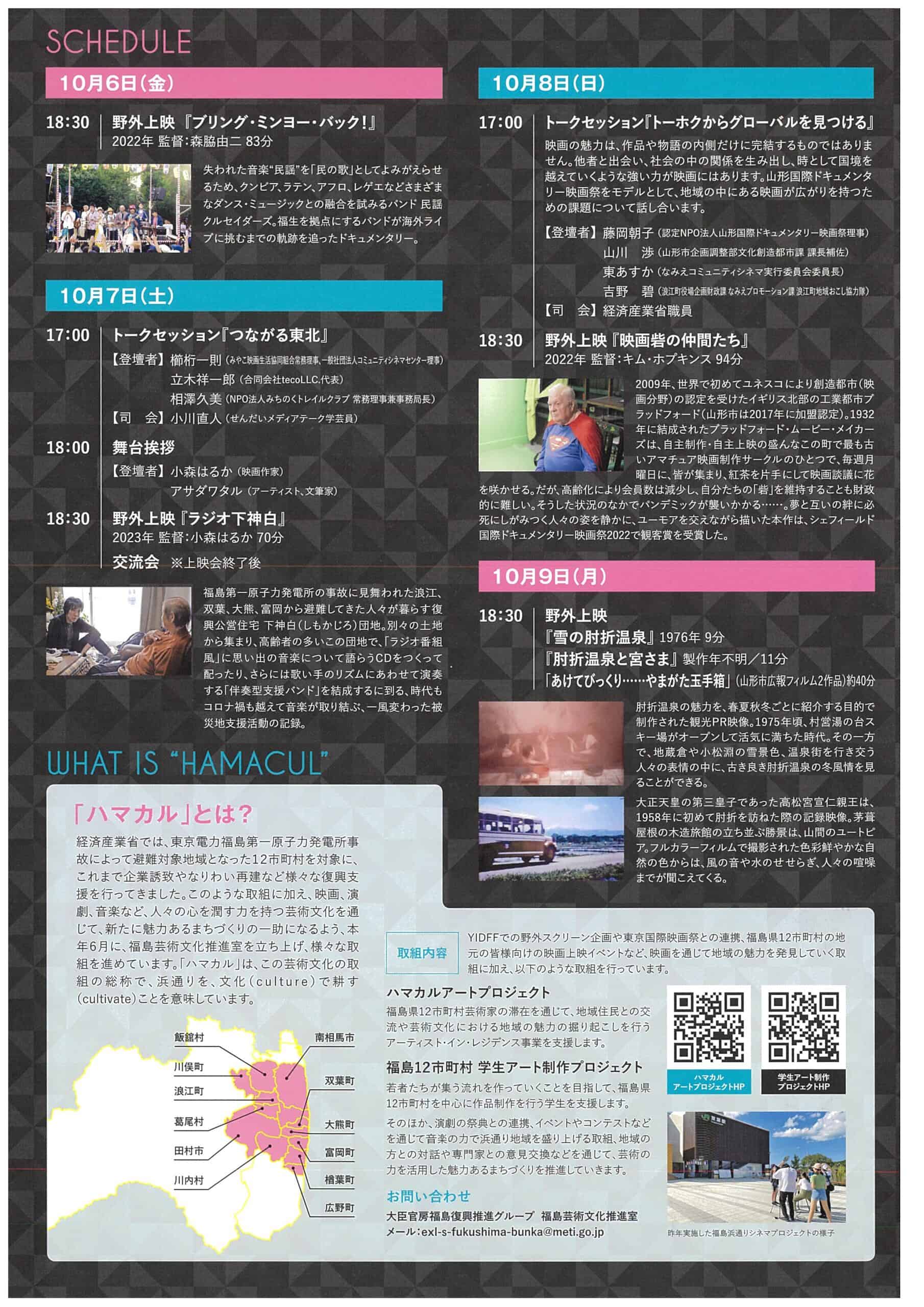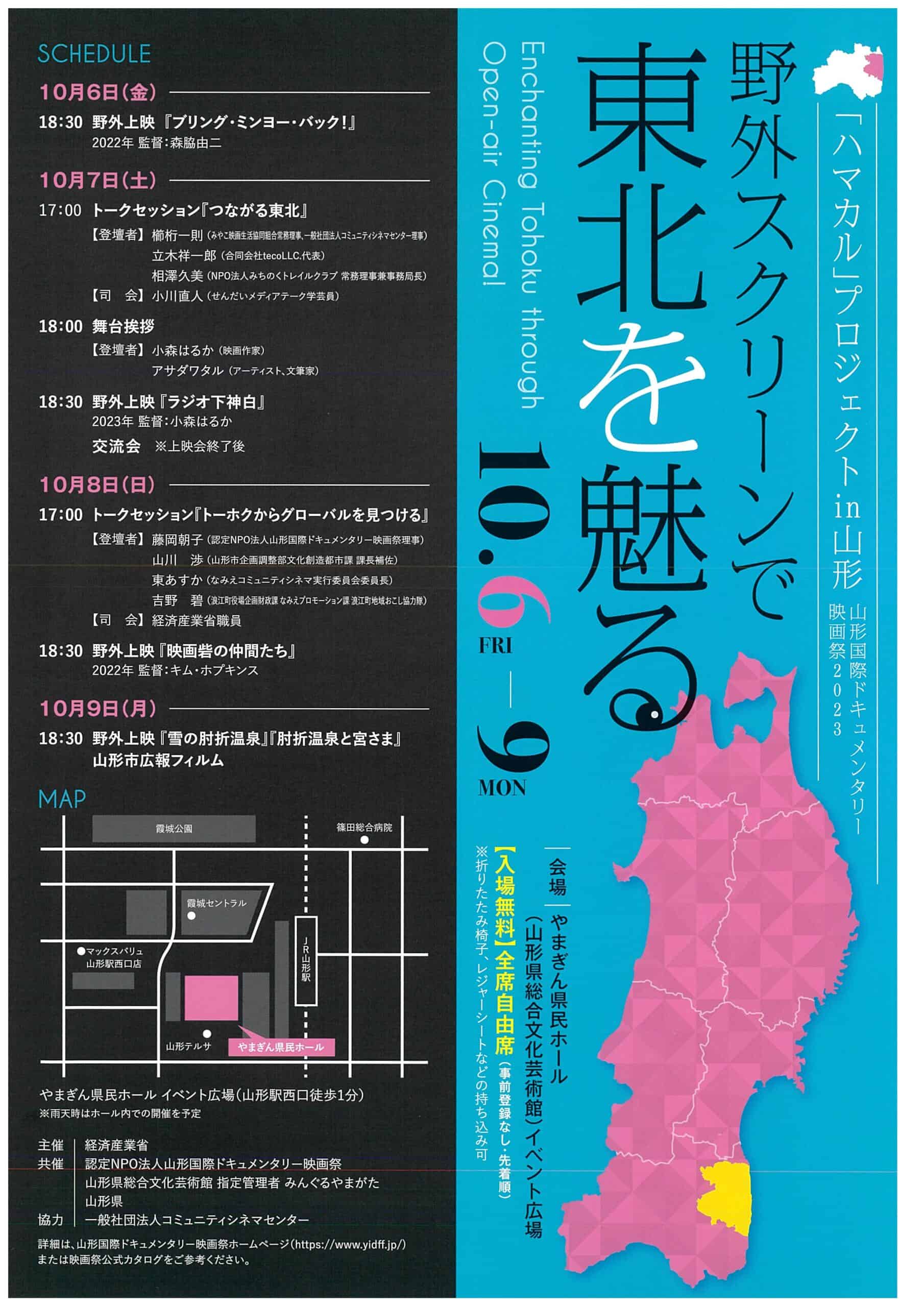 « すべてのイベント このイベントは終了しました。 野外スクリーンで東北を魅る 2023年10月6日18:30 無料 « みんなでやろう!英語でゲーム~初心者編~ チェリアフェスティバル 山形2023 » チラシはこちらからダウンロードできます(PDF) SCHEDULE 10月6日(金) 18:30 野外上映『ブリング・ミンヨー・バック!』 2022年 監督:森脇由二 83分 + Google カレンダー+ iCal エクスポート 詳細 日付: 2023年10月6日 時間: 18:30 参加費: 無料 イベントカテゴリー: 団体主催 主催者 経済産業省 会場 やまぎん県民ホール イベント広場 双葉町1丁目2−38 山形市, 山形県 990-0828 日本 + Google マップ Web サイト: https://yamagata-bunka.jp/