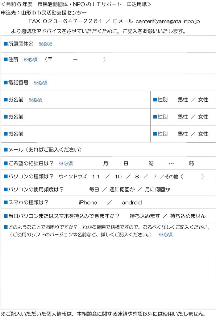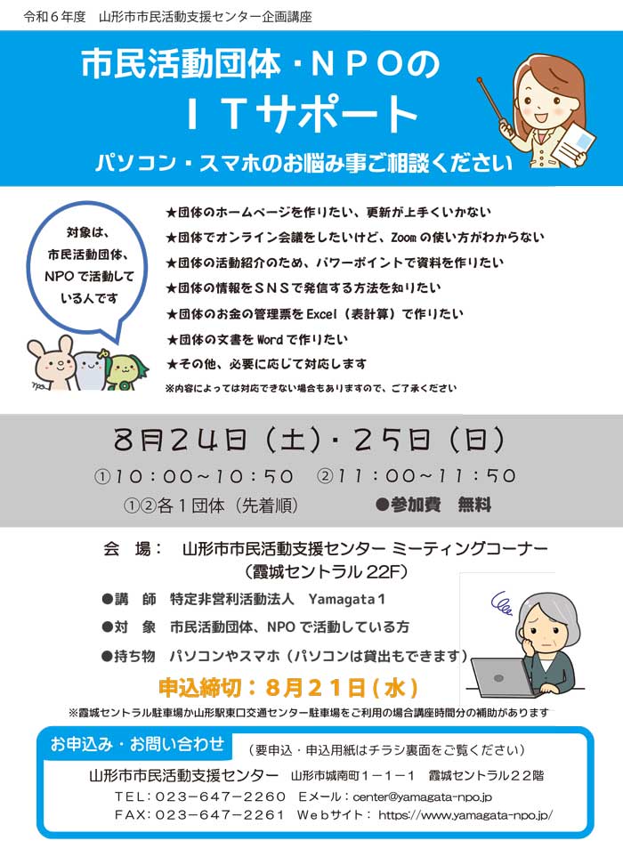 « すべてのイベント このイベントは終了しました。 市民活動団体・NPOのITサポート~パソコン・スマホのお悩み事ご相談ください~ 2024年8月24日10:00 - 12:00 « 令和6年度山形県男女共同参画 ユースリーダー養成講座 陶芸講座 しのぎの器・カップ&ソーサー(全2回) » チラシはこちらからダウンロード出来ます(PDF形式) + Google カレンダー+ iCal エクスポート 詳細 日付: 2024年8月24日 時間: 10:00 - 12:00 イベントカテゴリー: センター主催 主催者 山形市市民活動支援センター 電話番号: 023-647-2260 メール: center@yamagata-npo.jp 会場 山形市市民活動支援センター 23階 高度情報会議室 山形市城南町1-1-1 霞城セントラル23階 山形市, 山形県 9908580 日本 + Google マップ