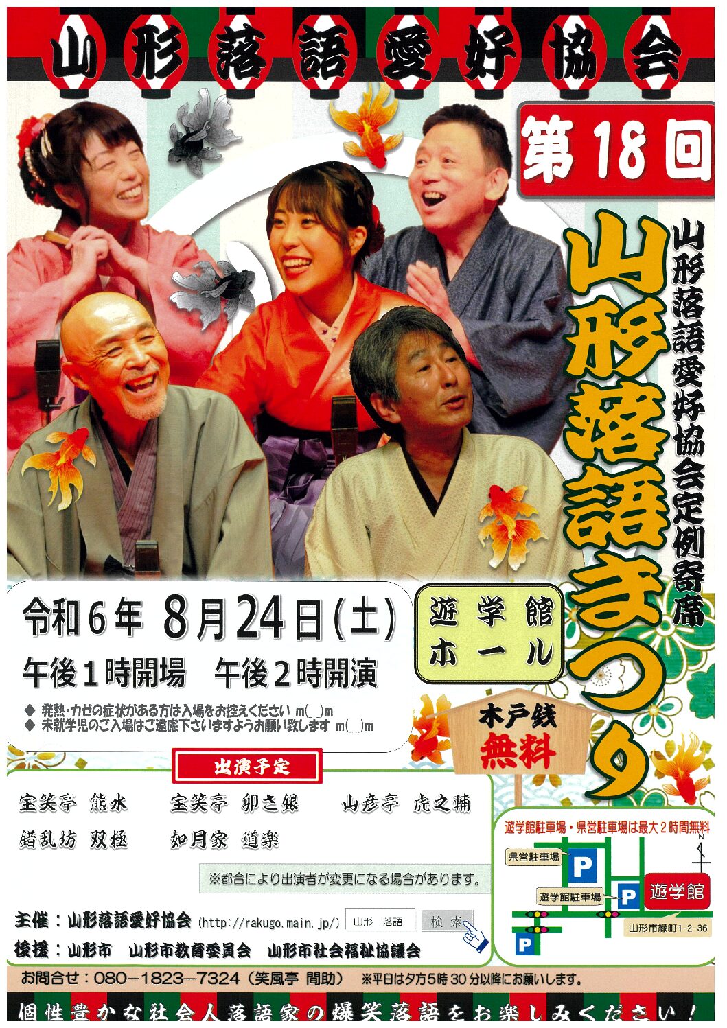 « すべてのイベント このイベントは終了しました。 山形落語愛好協会定例寄席 第18回山形落語まつり 2024年8月24日14:00 - 16:30 « かたばみの会*カフェでお話しませんか? 市民活動団体・NPOのITサポート~パソコン・スマホのお悩み事ご相談ください~ » ・チラシはここからダウンロ―ドすることができます。(PDF) + Google カレンダー+ iCal エクスポート 詳細 日付: 2024年8月24日 時間: 14:00 - 16:30 イベントカテゴリー: 団体主催 主催者 山形落語愛好協会 電話番号: TEL:080-1823-7324 Web サイト: http://rakugo.main.jp/ 会場 山形県生涯学習センター遊学館 緑町1-2-36 山形市, 山形県 9900041 + Google マップ