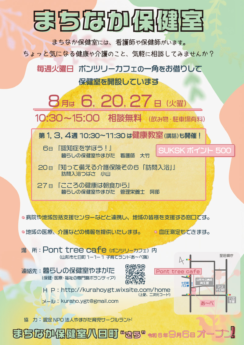 « すべてのイベント このイベントは終了しました。 まちなか保健室 知って備える介護保険その6「訪問入浴」 2024年8月20日10:30 - 15:00 « 見えない人がAIで描いたイラスト展 あい(AI)のあるアート展 あなたも「とぴボラ」してみませんか? » チラシはこちらよりダウンロード(PDF形式) + Google カレンダー+ iCal エクスポート 詳細 日付: 2024年8月20日 時間: 10:30 - 15:00 イベントカテゴリー: 団体主催 主催者 暮らしの保健室やまがた メール: kuraho.ygt @gmail.com Web サイト: https://kurahoygt.wixsite.com/ 会場 Pont tree cafe(ポンツリーカフェ) 山形市七日町1-1-1 + Google マップ