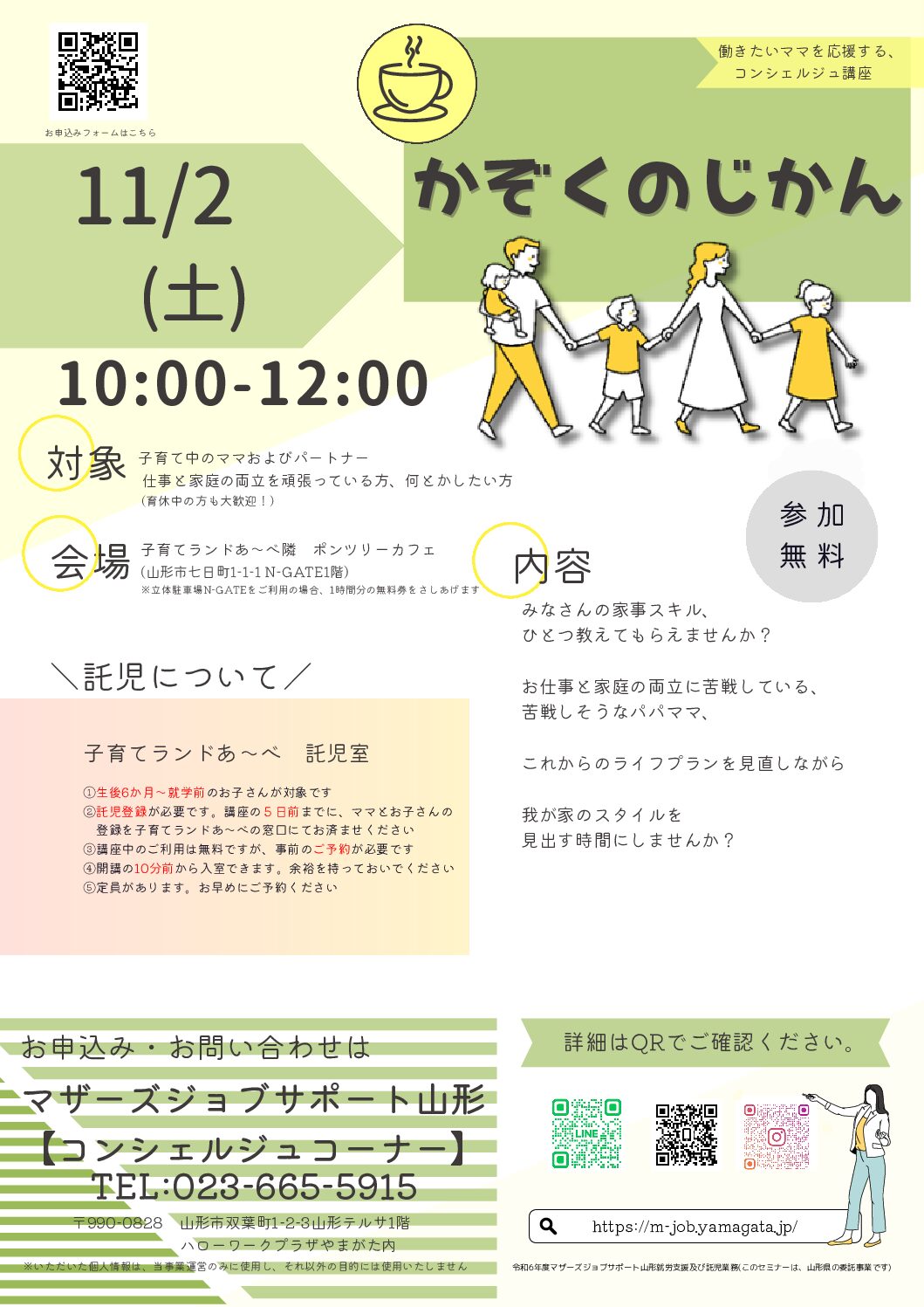 « すべてのイベント このイベントは終了しました。 かぞくのじかん 2024年11月2日10:00 - 12:00 無料 « 令和6年度「山形学」講座「おもしろ農楽」第2回 あいらぶ♡末広楽市楽茶 » チラシはこちらからダウンロード出来ます(PDF形式) + Google カレンダー+ iCal エクスポート 詳細 日付: 2024年11月2日 時間: 10:00 - 12:00 参加費: 無料 イベントカテゴリー: 団体主催 Web サイト: https://m-job.yamagata.jp/ 主催者 マザーズジョブサポート山形 電話番号: 023-665-5915 Web サイト: http://m-job.yamagata.jp/ 会場 子育てランドあ~べ 研修室 山形県山形市七日町1-1-1 N-GATE 1階 + Google マップ 電話番号: 023-615-1930